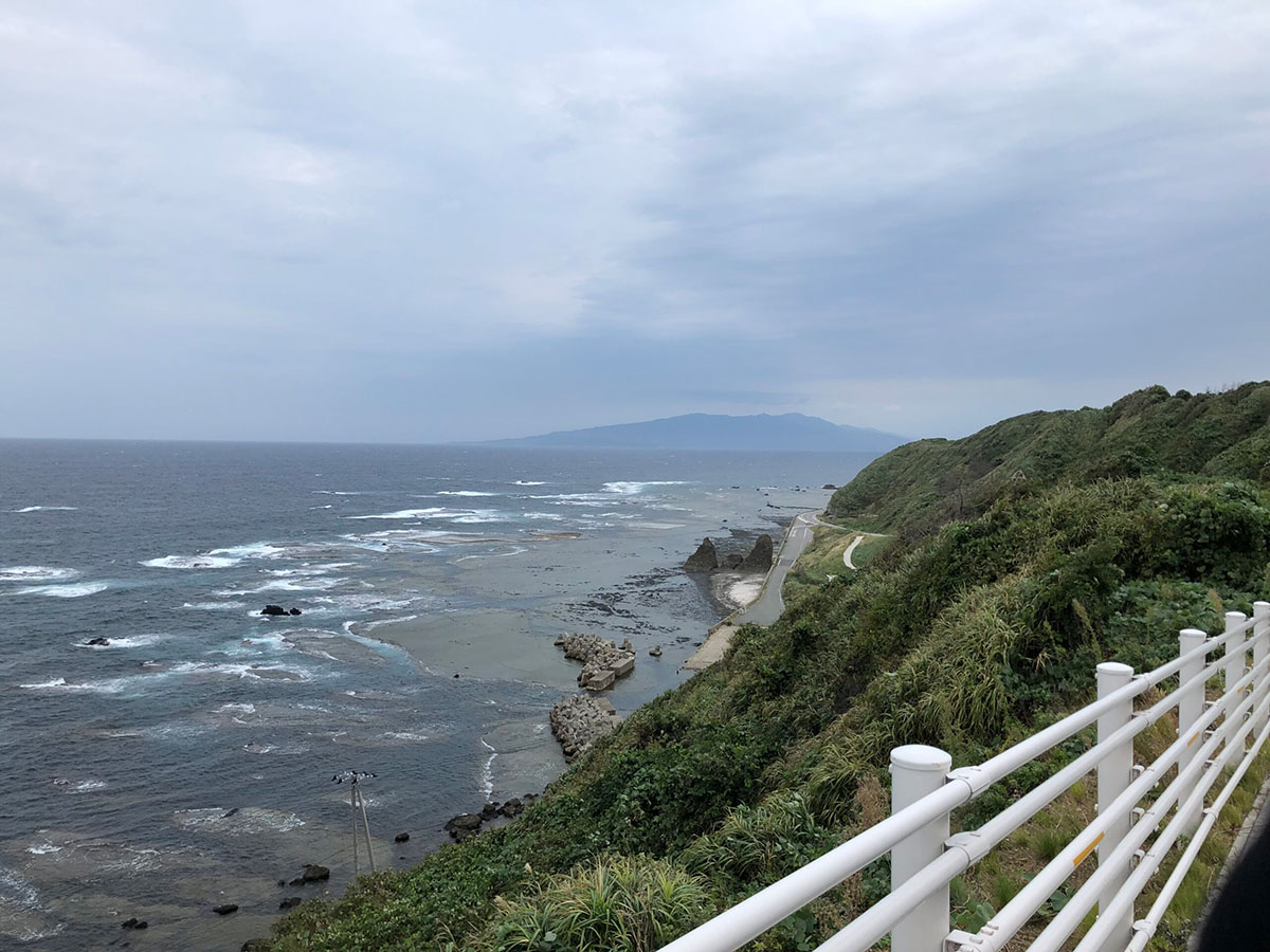 強風のなか素浜あたりで45号を見失い、さらに海沿いの道が崖で行きどまり、なんてことがあったのでこの時はちょっとココロが荒んでいました。夕方から大雨が来るとの予報なので、向こうに見える大佐渡との間の市街地、佐和田あたりまで早く行きたい。