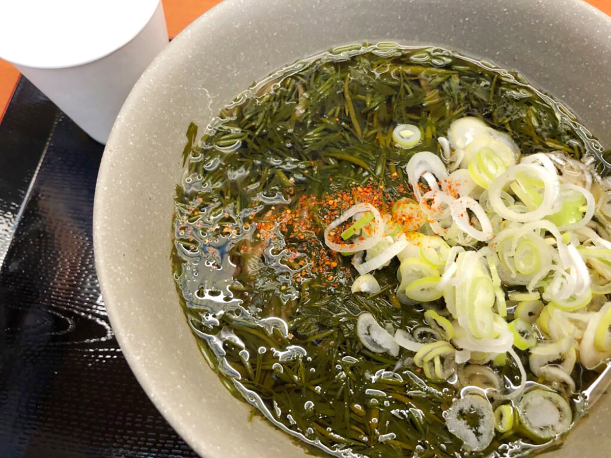 ここで海藻、アカモクたっぷりのご当地グルメの ながもそば をいただきました。