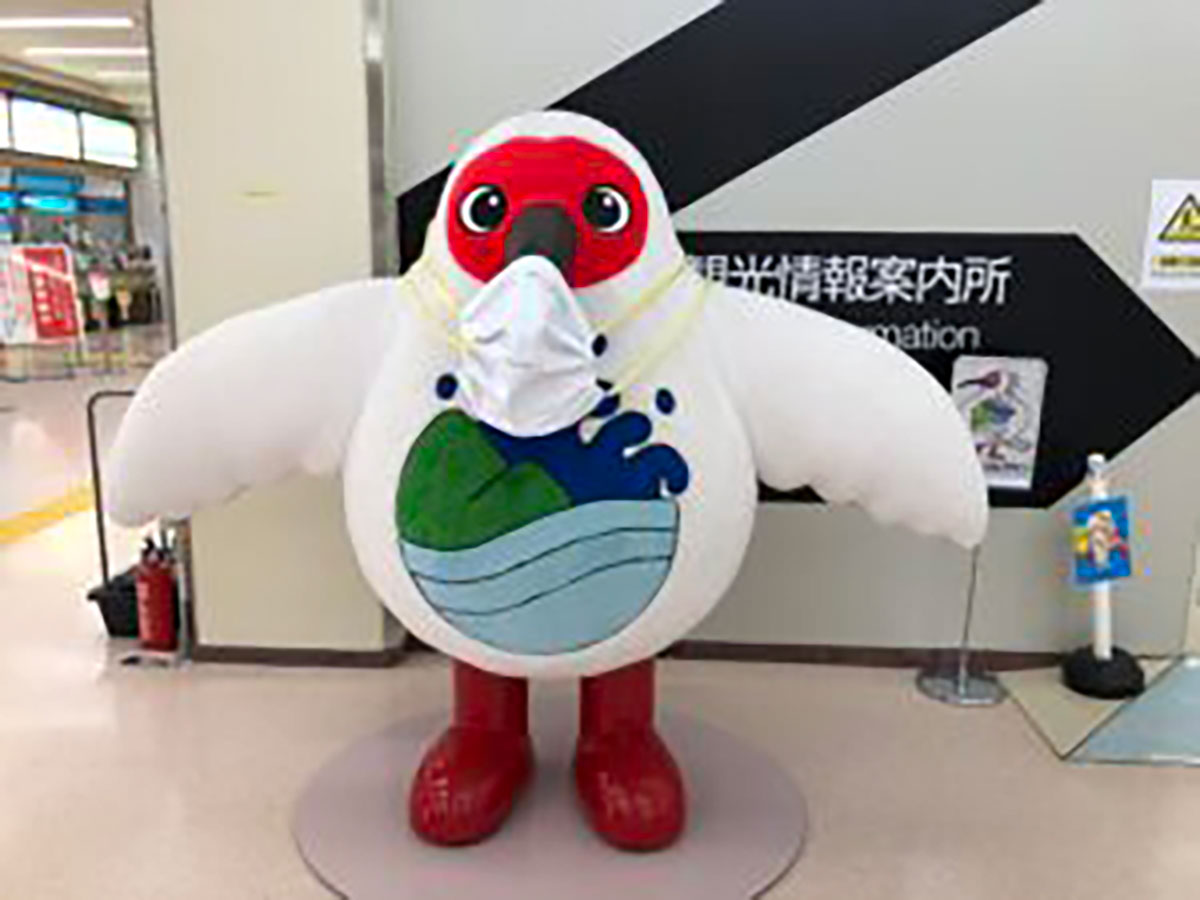 佐渡のゆるキャラ、サドッキーがマスク付きでお出迎え(笑)。