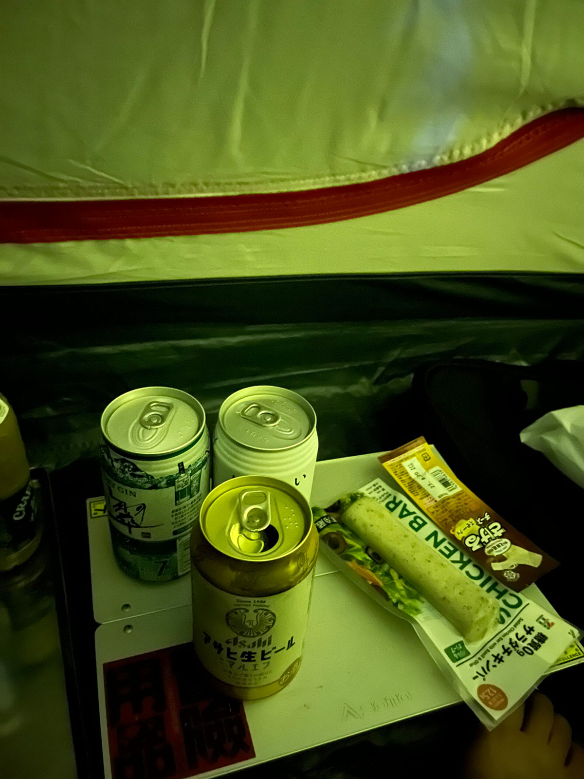 その日は平日の月曜ということもあり他には誰もおらず、すっかり日の暮れた雨のキャンプ場でひとり、完全ソロ貸し切り状態♪ とはいえ雨で焚火もできず途中で買い出した食材とともに、雨天でも抜群の居住快適性を誇るラフツーリングテントの中で籠城決定。