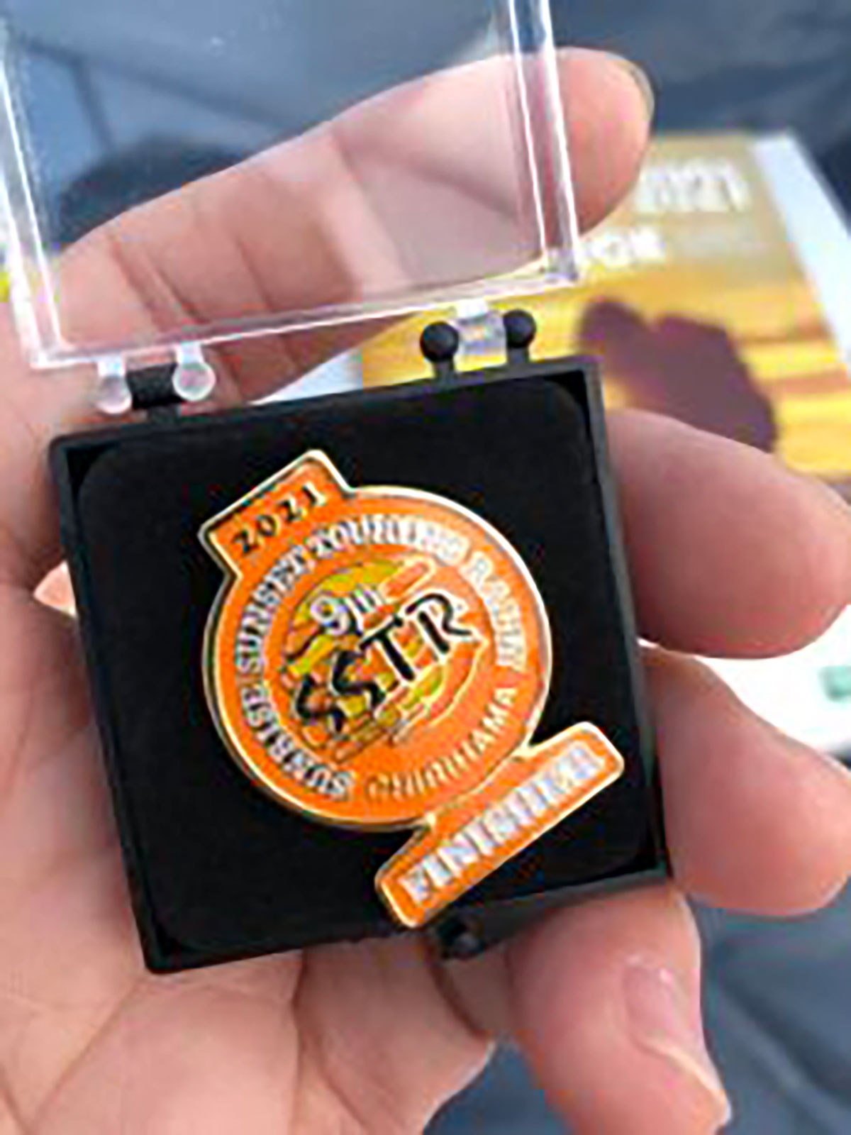 SSTR完走翌日の早朝。快適な新型のテント※の中でフィニッシャーズバッジを見ながら、ひとりニヤけるワタクシ……。