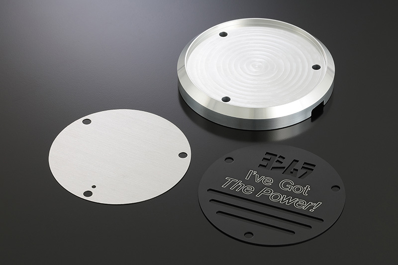 アルミ削り出しベースプレート、ステンレスのヘアラインプレート、ブラックアルマイトプレートのトリプルコンビネーションにより、コントラストが映える立体的な表情を生み出しています。