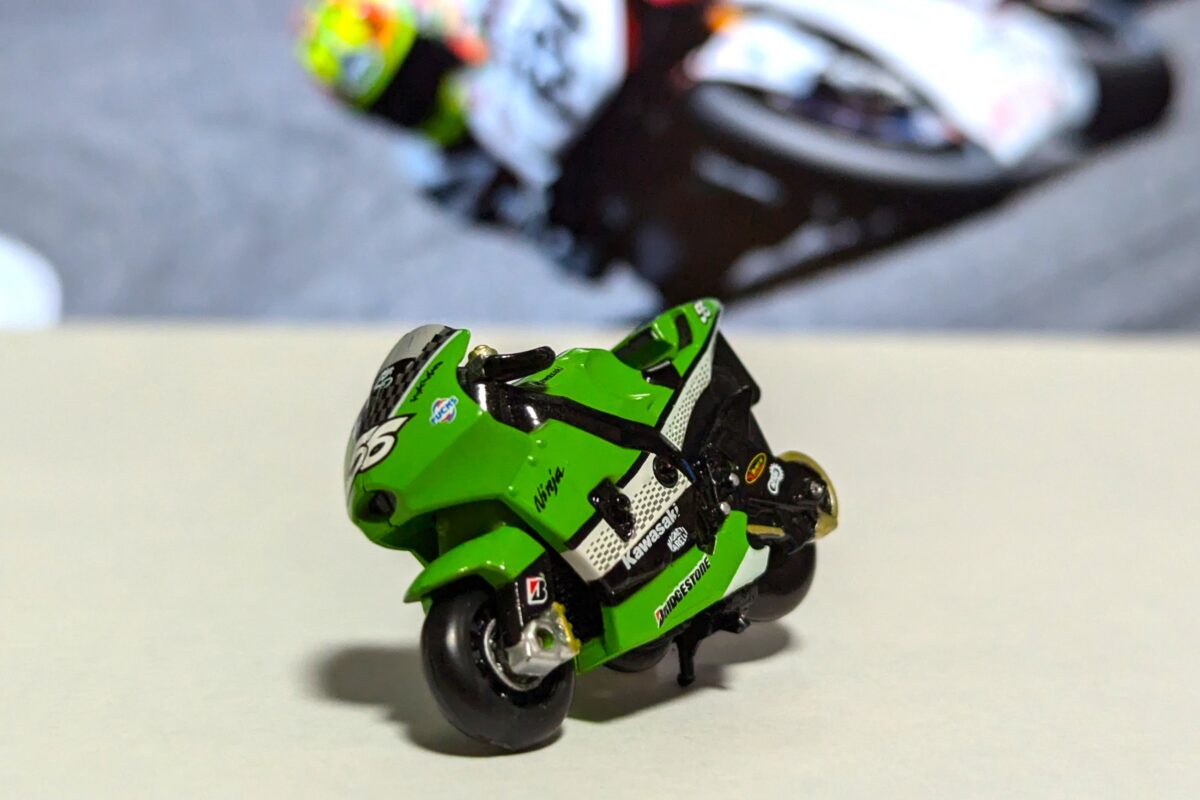 ZX-RRは、MotoGPクラスに2002年後半から2009年にかけて参戦したレーシングモデルです。チョロバイは、2004年モデル「ゼッケン56 中野真矢」「ゼッケン66 アレックスホーマン」を忠実に再現しています。