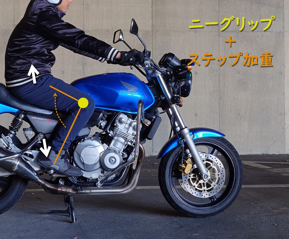 その姿勢で同時に「ニーグリップ」を行うことで正しい運転姿勢に近づきます。近くにバイクがある方は試してみてください。ステップへ体重が移動すると「しっかり座れる」「下半身ホールド」「視野が広くなる」といった感覚を覚えるかもしれません。