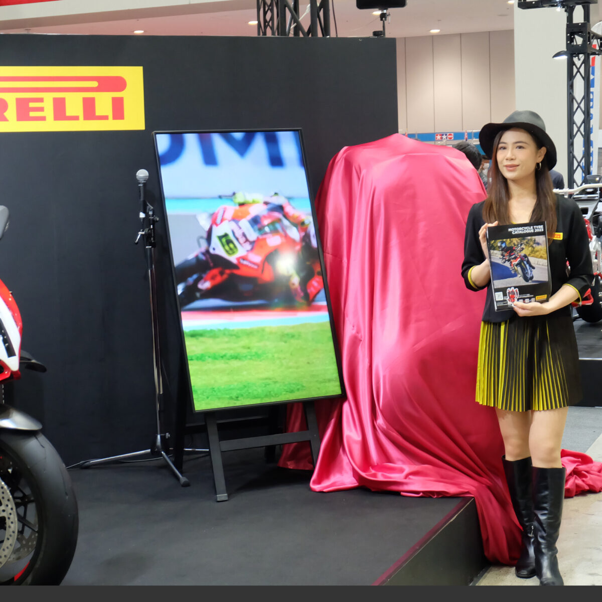 5、4、3、2、1のカウントダウンとともに赤いベールの中からDIABLO™ SUPER CORSA V4が登場。大きな歓声が上がった。右の女性はピレリコーナーのコンパニオンを務めてくれためぐみさん。