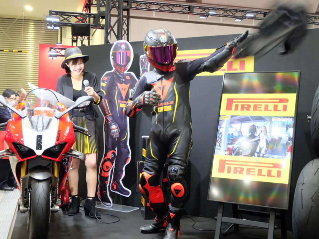 トンちゃんとの掛け合いで、DIABLO™ SUPER CORSA V4のプレゼンテーションを行ったピレリジャパン二輪部門責任者の児玉部長。DIABLO™ SUPER CORSA V4は「グリップして、乗り心地が良くて、ハンドリングのいいタイヤです」とのこと。