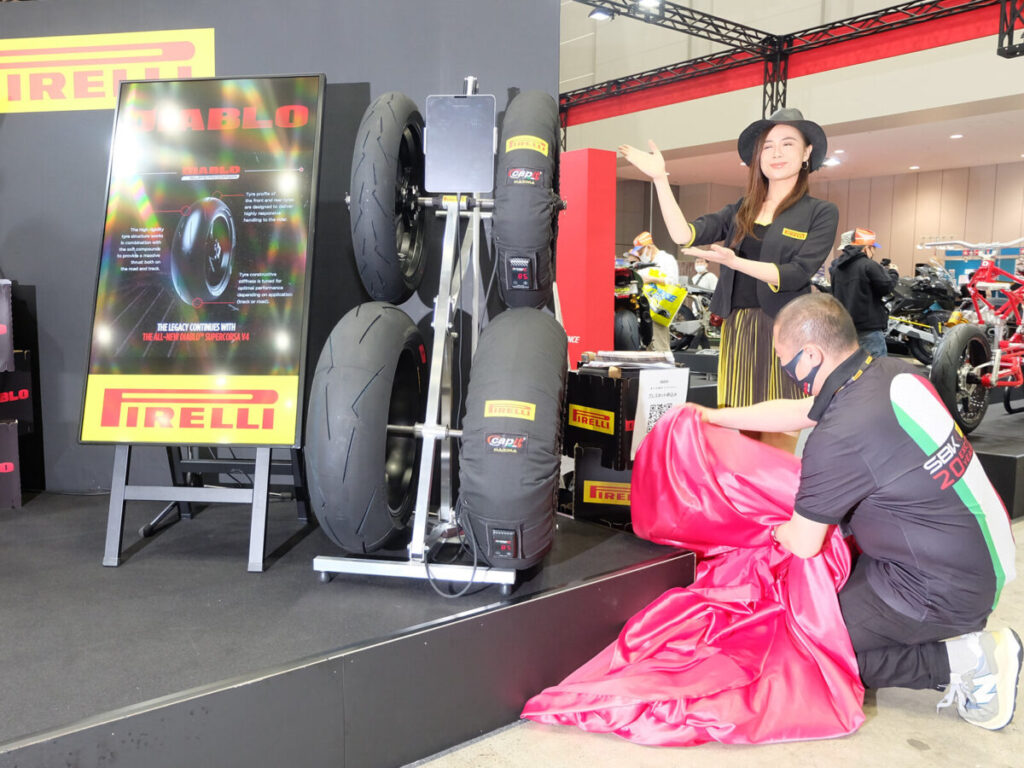 まずひとつめは、ピレリコーナーの右端に置かれたベールをかぶったタイヤ。MCのトンちゃんこと佐藤ともみさんの発声でアンベールされたのは、今シーズンの大注目新製品であるDIABLO™️ SUPER CORSAの第4世代にあたるV4でした。