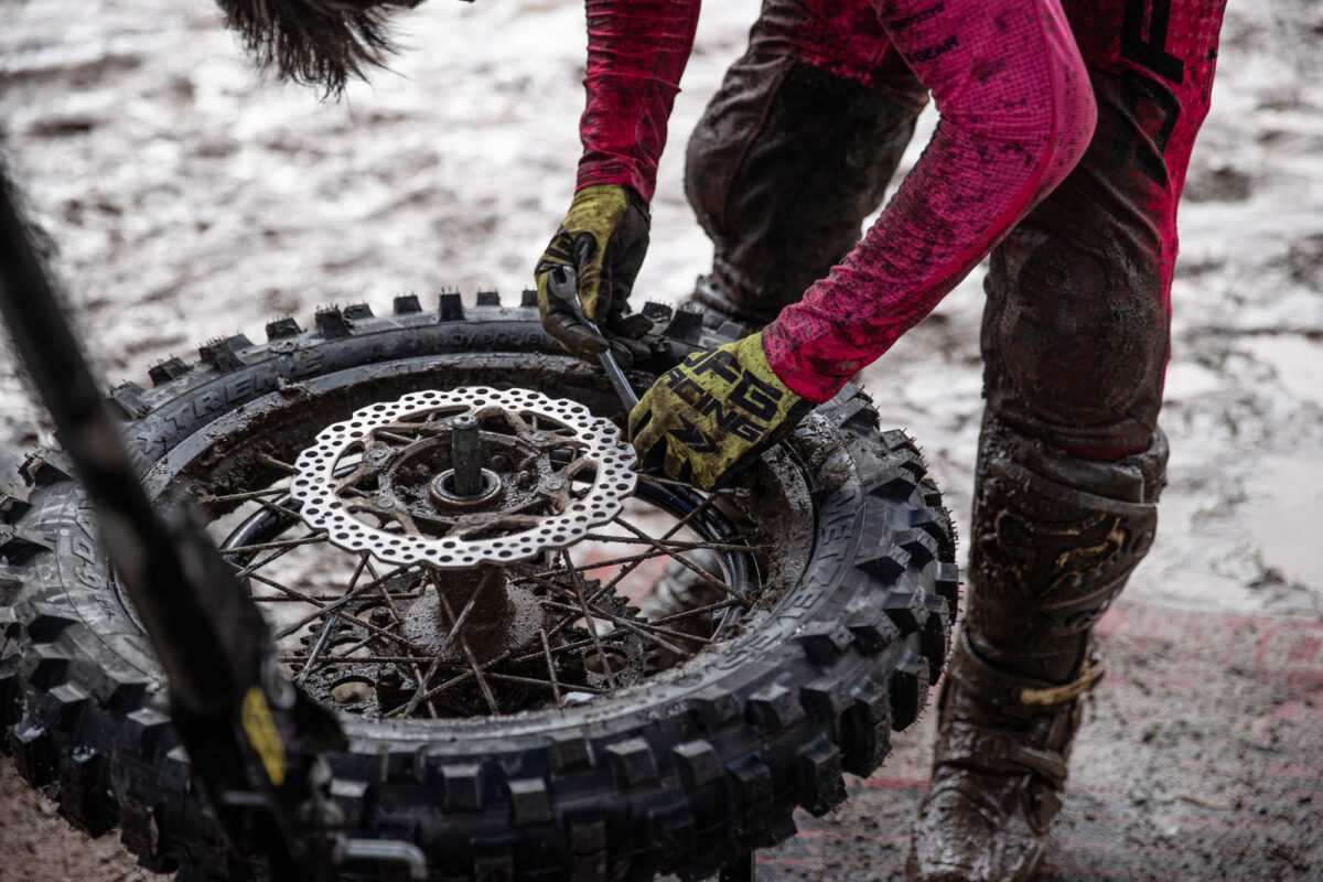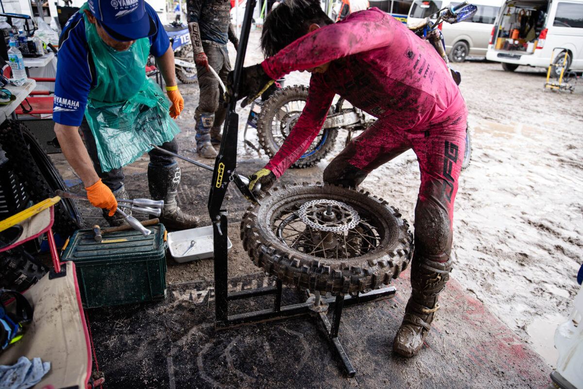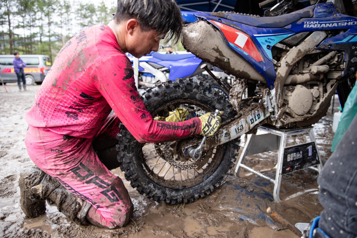 バイクにホイールを組み付けます。今回はマディコンディションだったこともあり、バイクに泥が付着しているため非常にやりづらいところです。馬場選手のバイクは、アクスルナット付近に泥が付いていたので、これを掃除しながら装着することになりました。ちなみに、アクスルブロックは純正と違って向きがわかりやすい、ZETA RACINGの製品を使用していたため、こういった煩雑な状況でも迷わず取り付けできました。