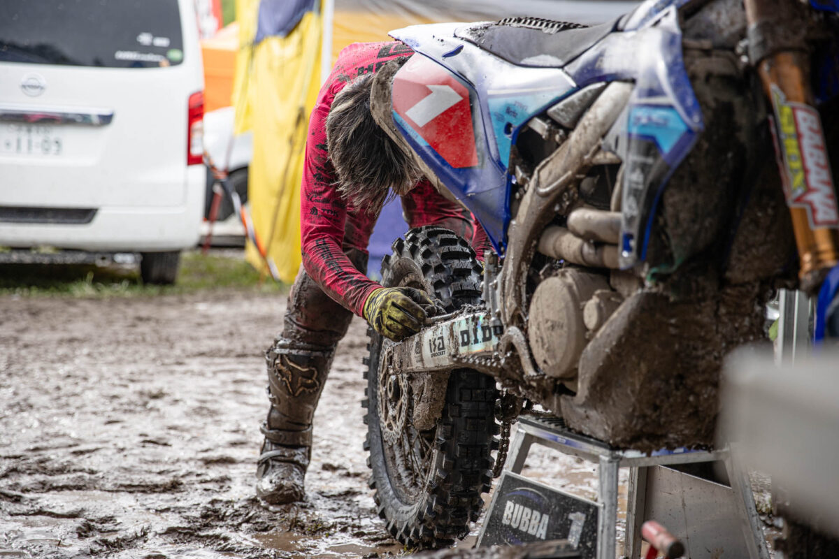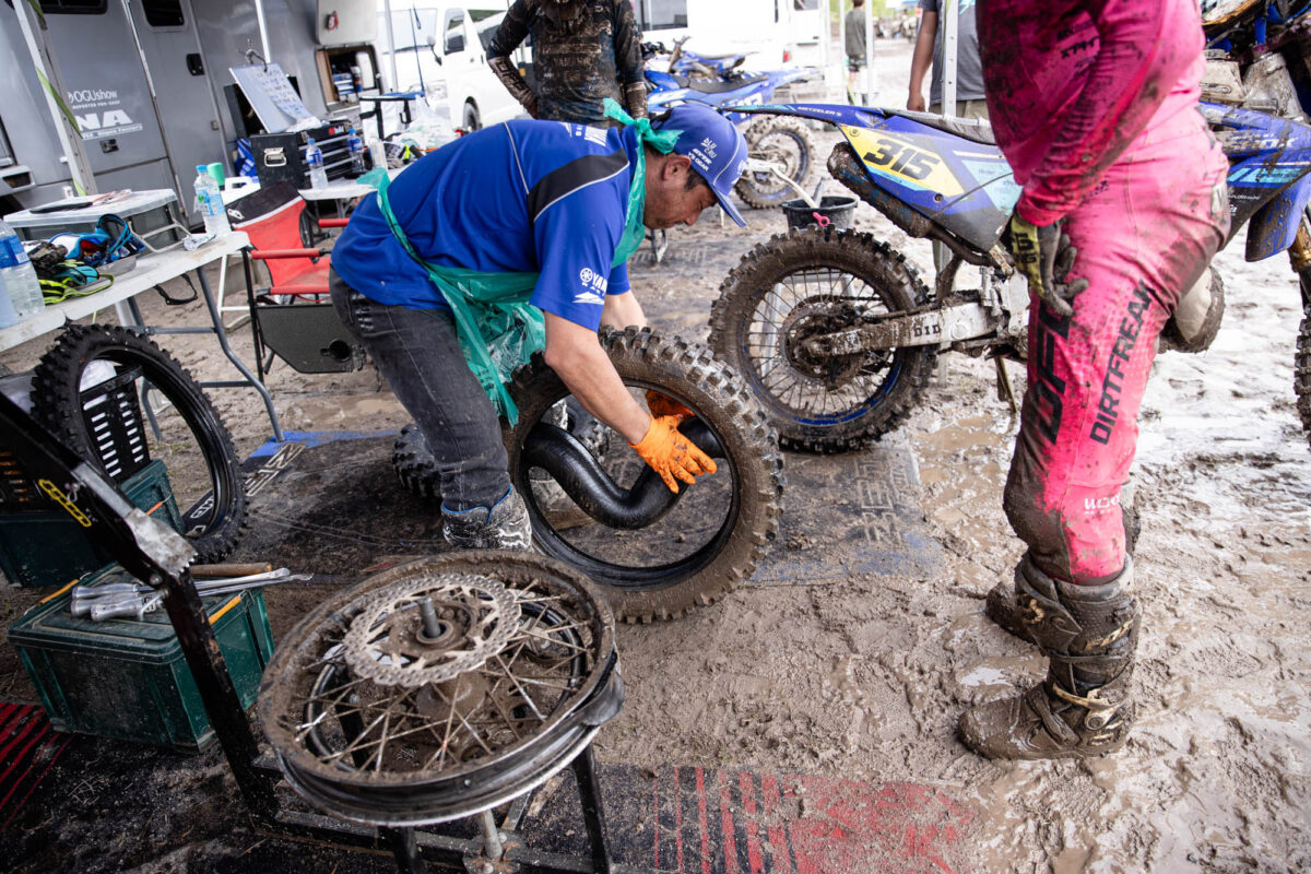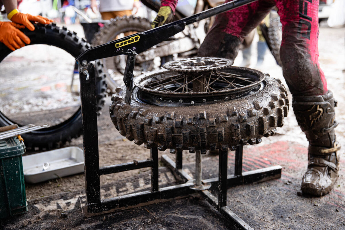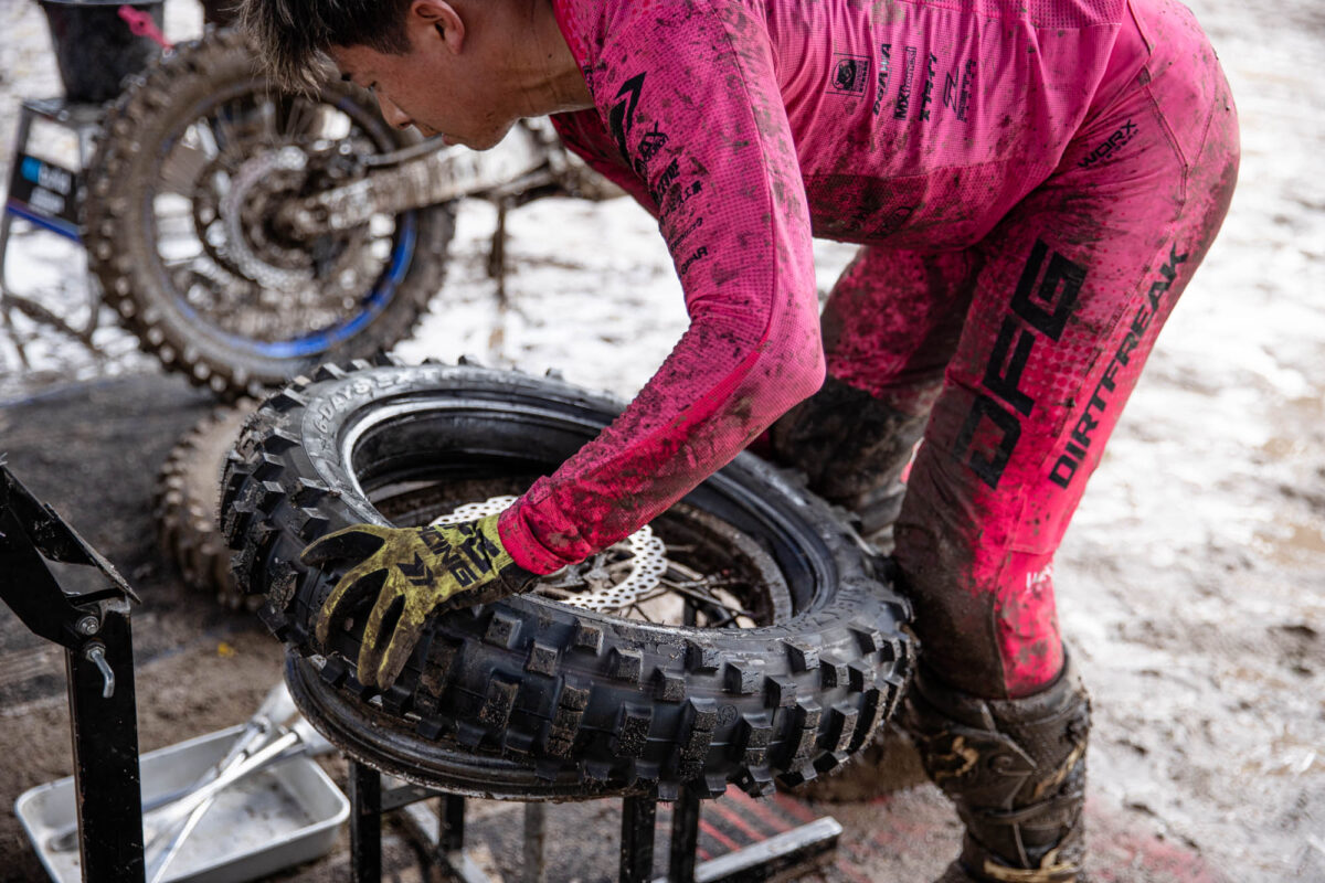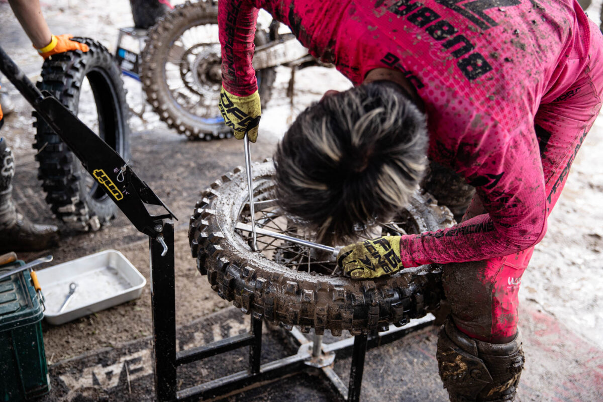 オンタイムエンデューロのハイライトと言えばワーキングタイムでのムースタイヤ交換。2デイズのレースで1日目の終わりに与えられるわずか15分の時間で、ライダーはタイヤを交換しなくてはなりません。いや、正確に言えばその15分の間でピット間を移動したり、エアフィルターを交換したり、様々なメンテナンスをこなさなければならないので、タイヤ交換にかけられる時間は実質10分といったところでしょうか。しかし、一般的に考えてオフロードバイクの前後タイヤ交換を10分以内に完了できますか? しかもムースタイヤという特殊なケースで。だからこそ普段練習したテクニックの見せどころなのです。今回は、2025年の全日本エンデューロRd2チーズナッツパーク大会で取材した、馬場亮太選手の実際のレース中における交換手順からノウハウを探ってみましょう。
