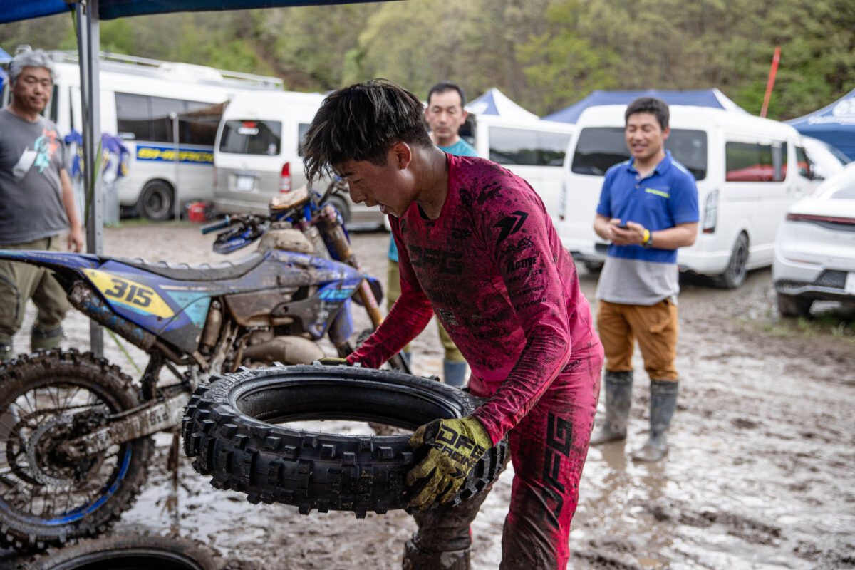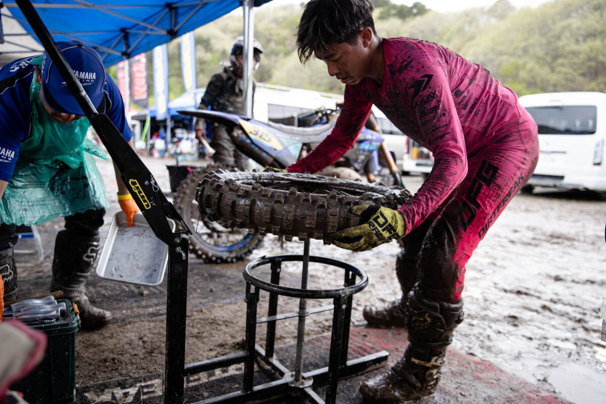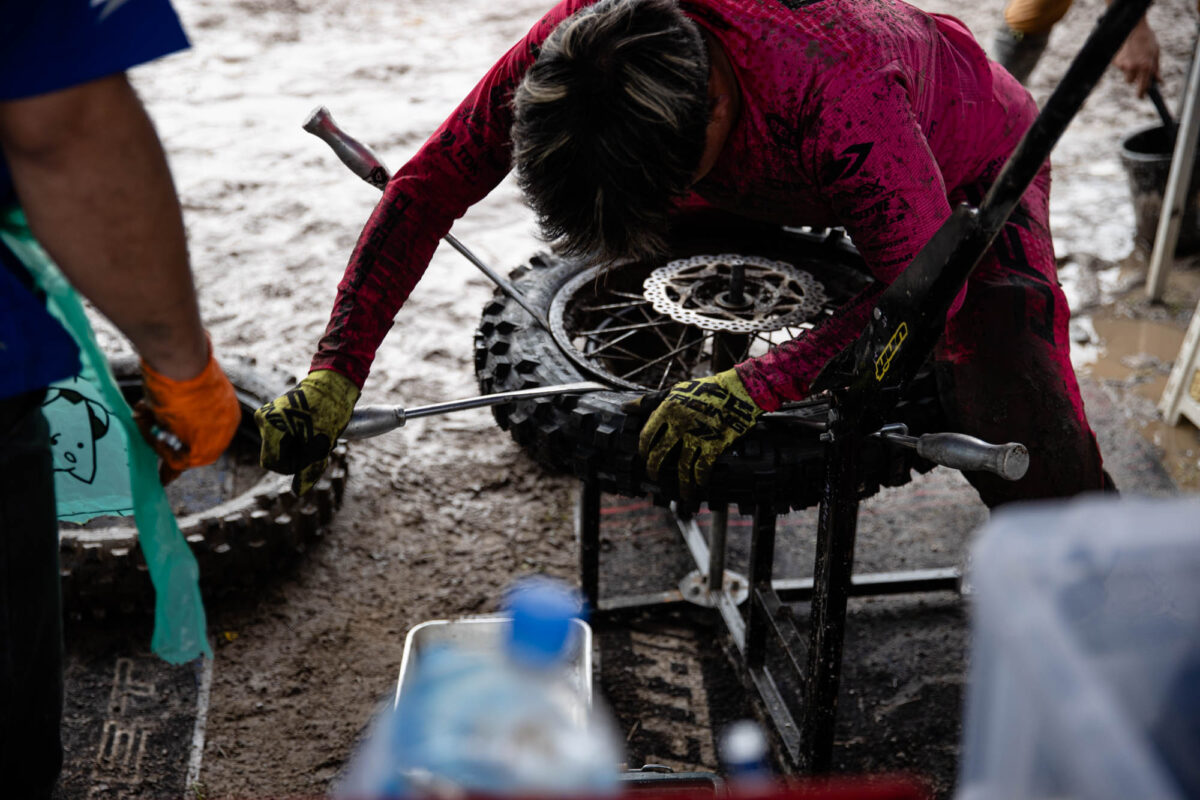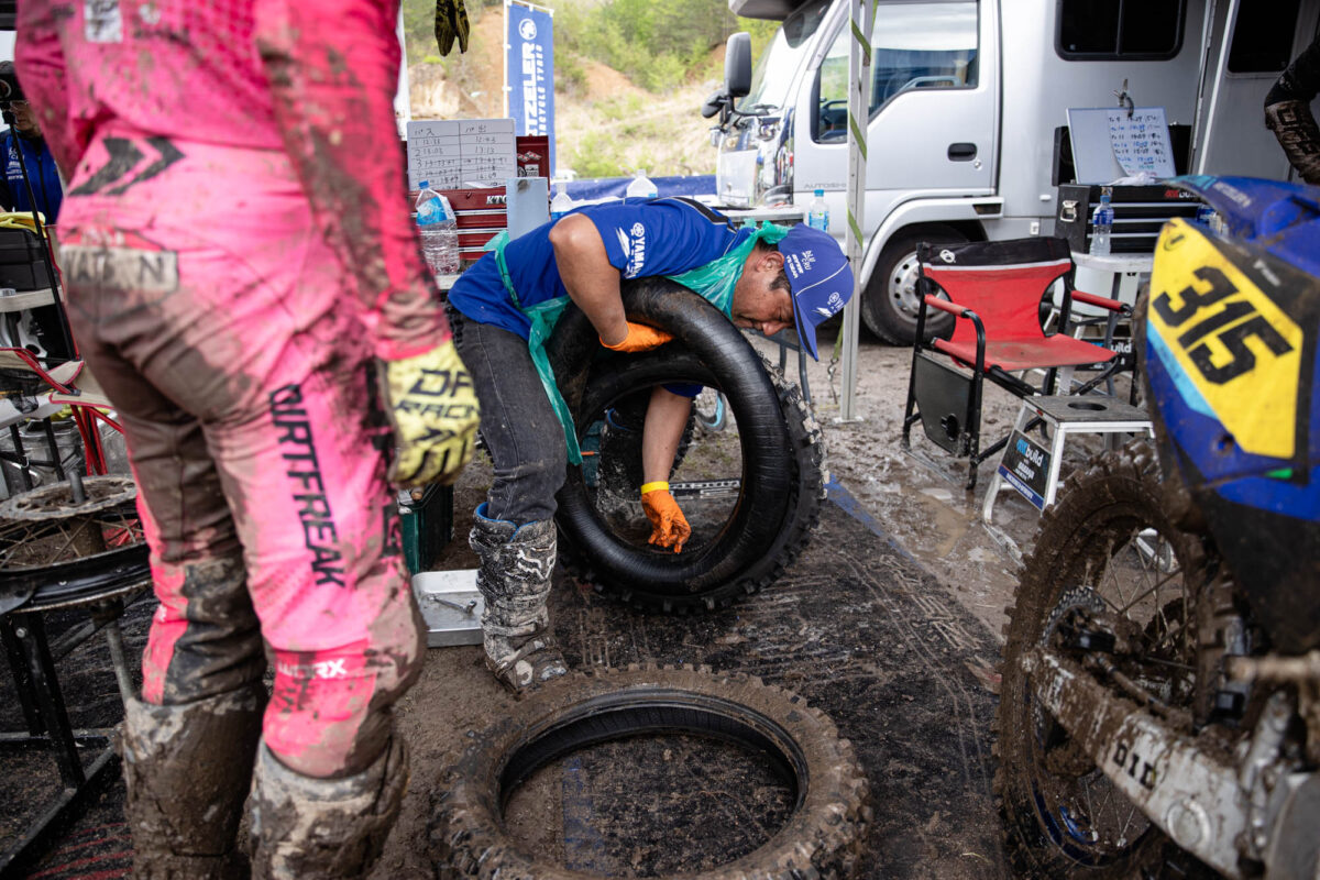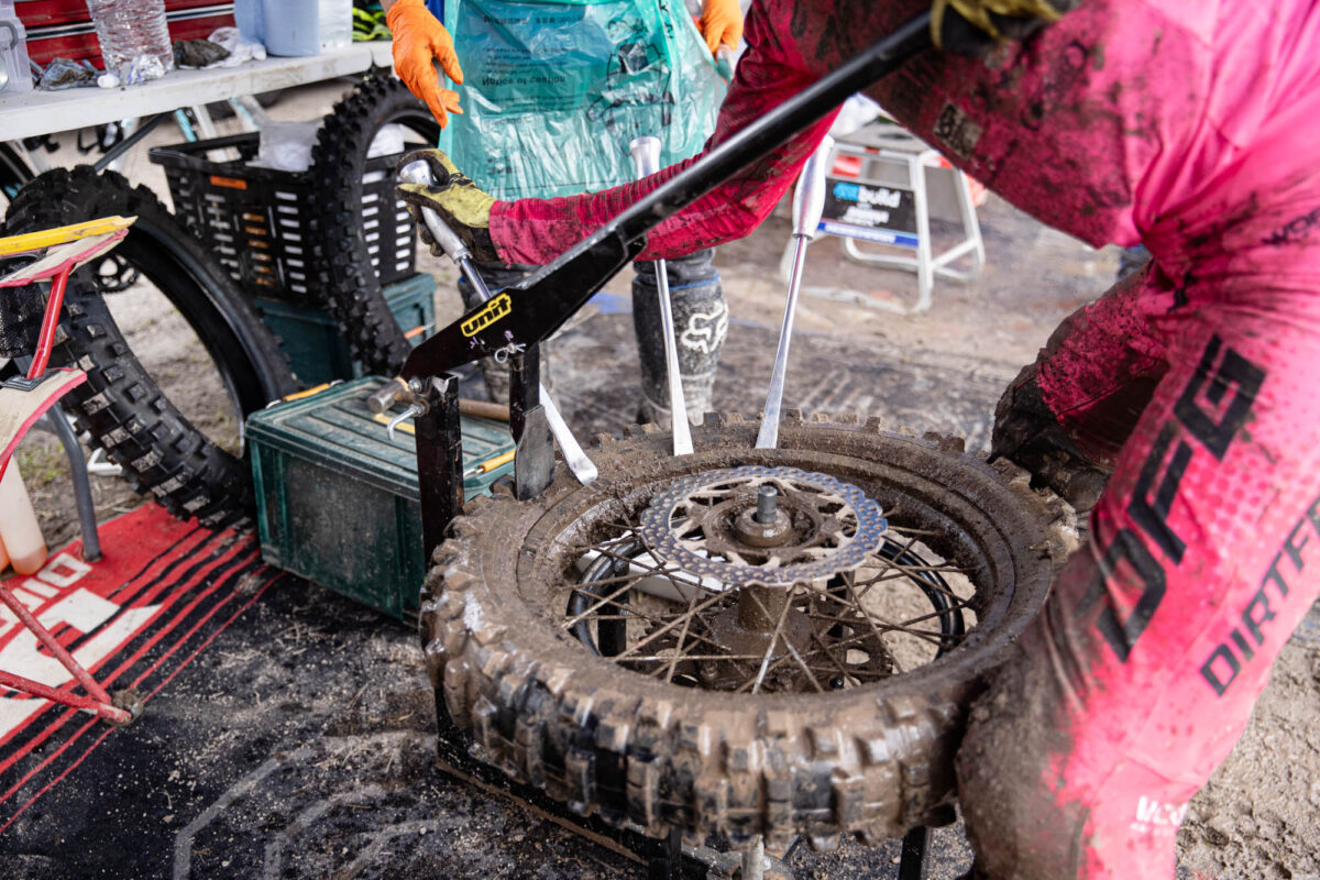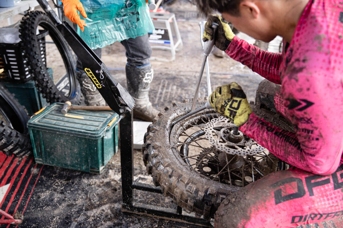 おおよそ5分30秒くらいのタイムでリアタイヤを交換した馬場選手。今回は馴染んだフロントタイヤを使いたかったため、フロントは交換しなかったのですが、このペースで作業完了できるのであればレース後のワーキングタイム15分以内に交換できますね。ちなみに、暑い日などはムースがパンパンに膨れ上がってムース交換が難しくなったりしますし、慣れないタイヤブランドだといつもより硬いせいで作業が困難になることもあります。タイヤ交換は、常に同じ状況ではない、ということを頭に入れてオンタイムエンデューロに臨んでください!