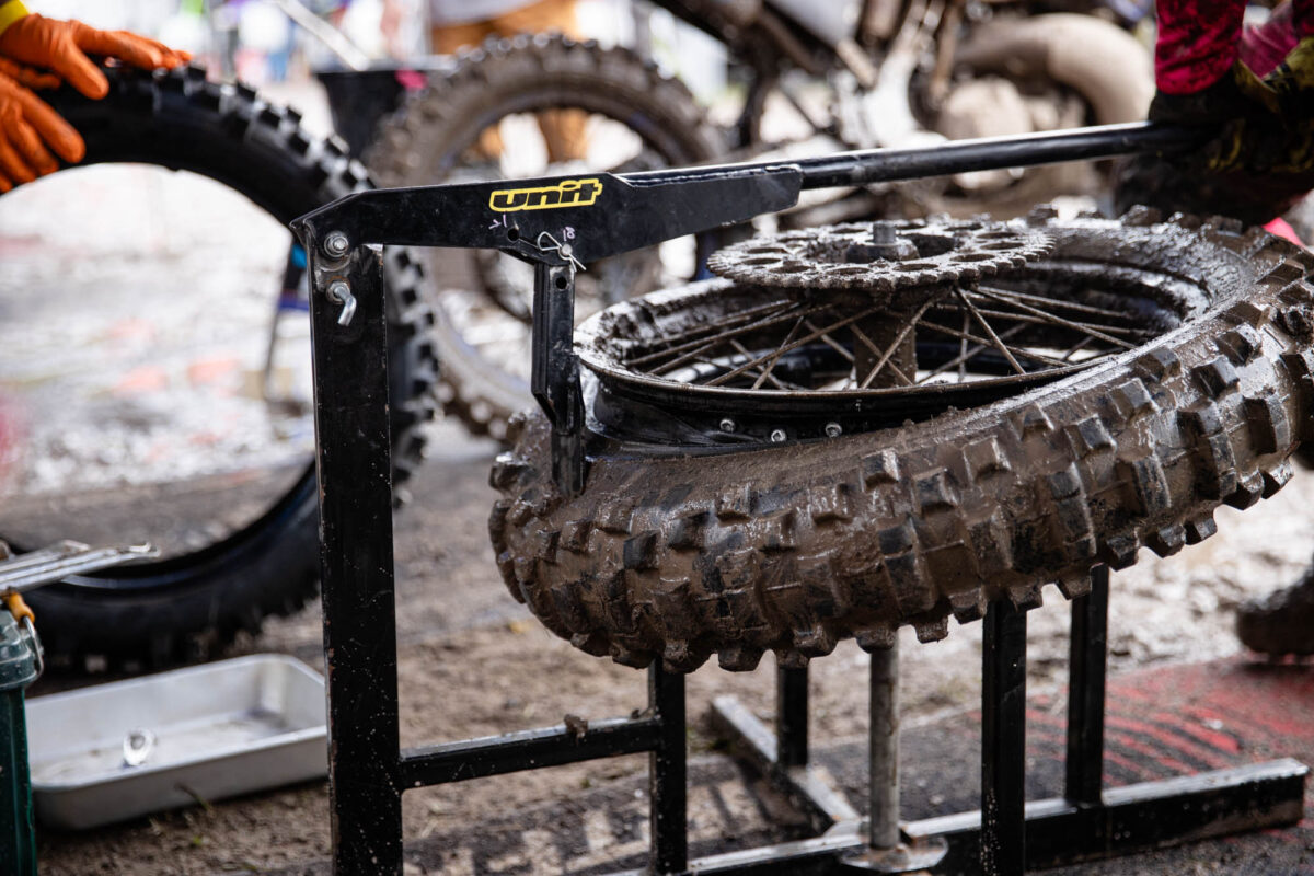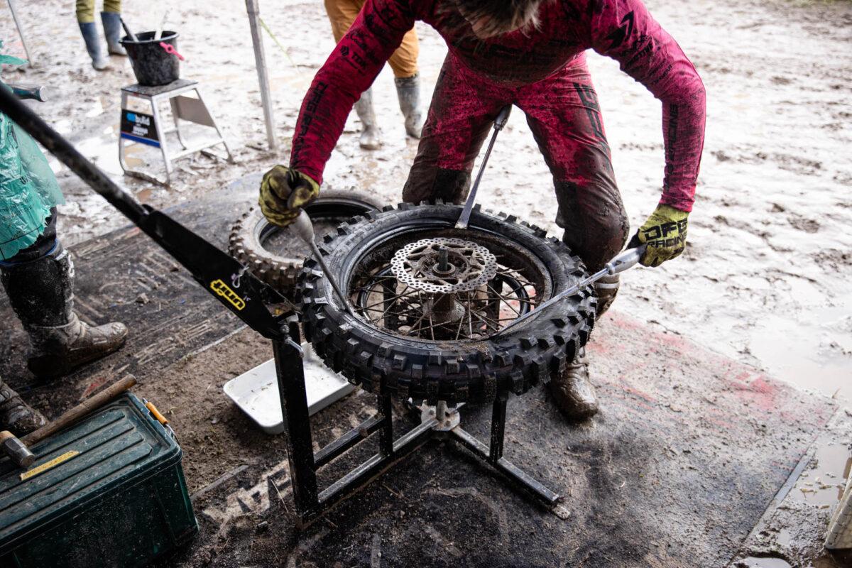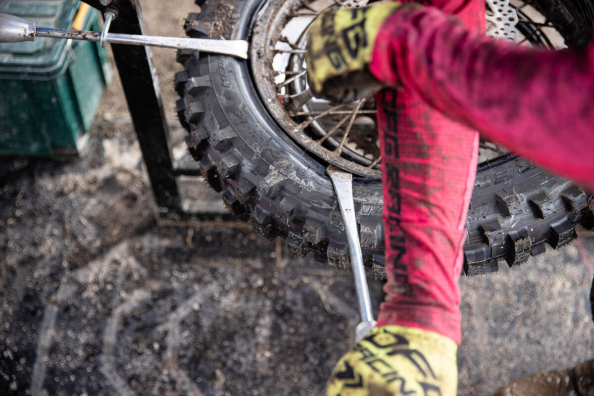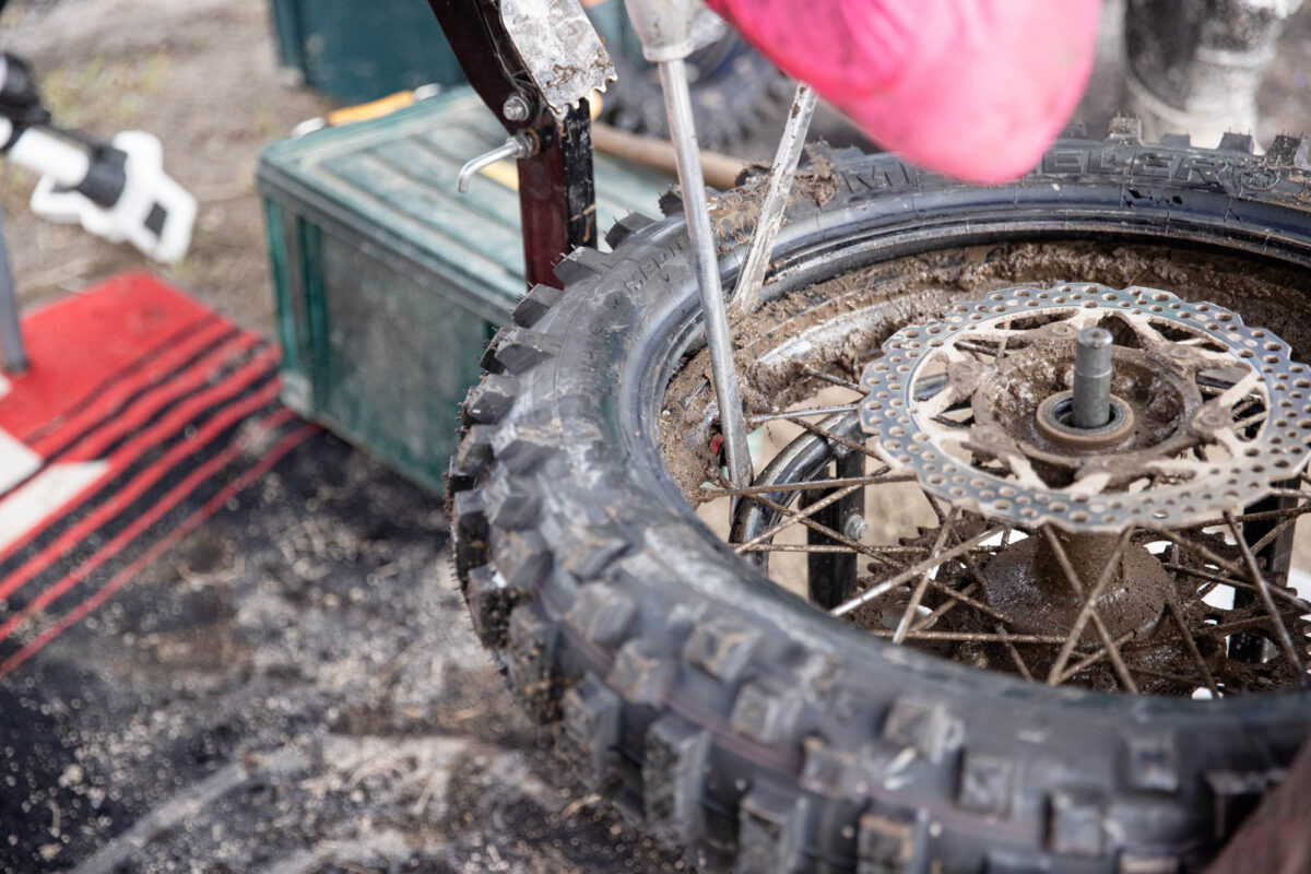 バイクを置く場所はエンデューロの規則で環境保護マットを使用すること、と定められています。また、タイヤ交換をするので当然センタースタンドにバイクを載せなくてはいけません。急いで交換作業をするため、無用なトラブルを避けられるようリフト式のスタンドは避けたほうが無難ですね。また、スタンドの脇にはアクスルシャフトを外せる工具をトレイに入れて用意しておきます。使う工具はすべて用途に合わせてわかりやすい場所に置いておくのが基本です。なお、今回はムースを新品タイヤに入れ替える作戦だったため、タイヤを外してからでないとムースを新しいタイヤに入れられなかったのですが、できればムースはムースグリスを塗って交換するタイヤに仕込んで準備しておきたいところです。