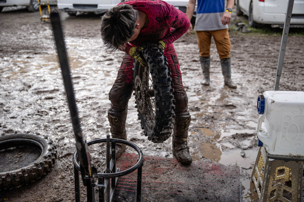 このチーズナッツパーク大会は、ひどい雨に見舞われてコンディションは終日マディ。こういう日こそ、ガレージでのムースタイヤ交換では得られなかった知見が得られるというものです!