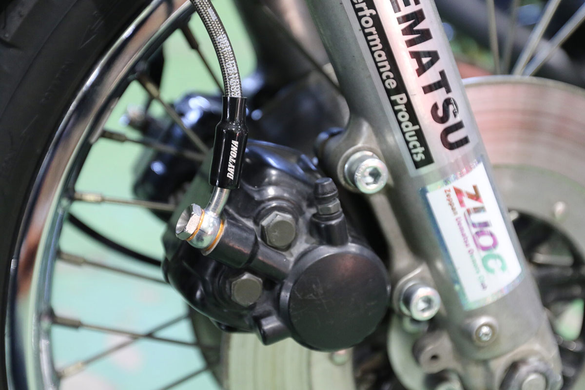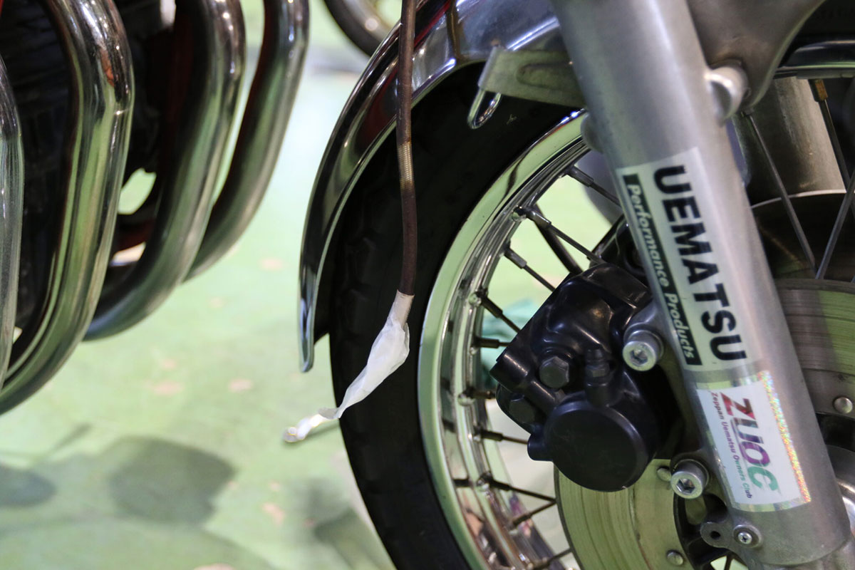 10年前に完成、現在は走行距離13万超となったカズ兄のZ2です。シャシーはトリプルディスクブレーキ標準装備のZ750Four(D1)を選びました。納車当初からブレーキマスターはデイトナの別体タンクマスター(横型5/8)が装着され、ブレーキホースはステンレスメッシュ化されていました。キャリパーはノーマルのままですが、公道においては必要にして十分なブレーキ性能でした。今回はデイトナの秘密工場に向かう道すがら、別体タンクマスターの操作性をチェックしました。