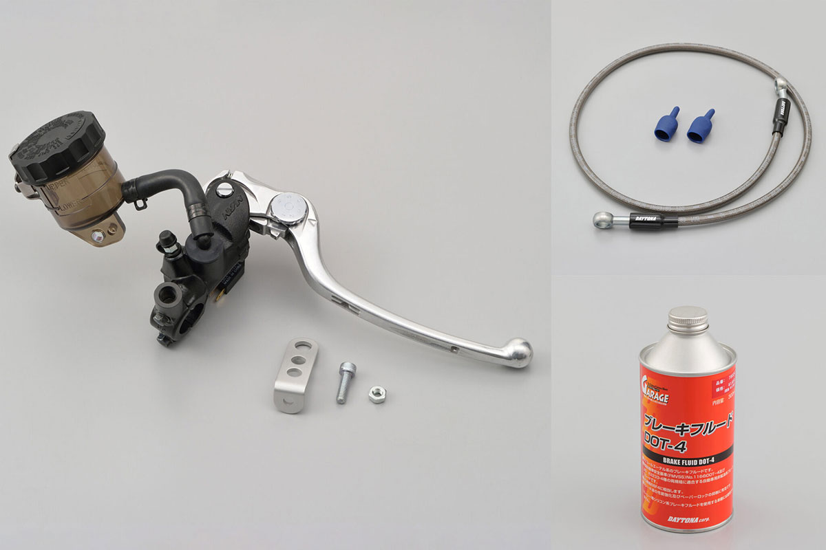 カスタム作業が上手いくか否かは、事前の準備にかかっていると言っても過言ではないです。段取り8割ってことですね。必要なパーツは、ラジアルマスター19mm・ブレーキホース・バンジョーボルト・バンジョーボルト用ワッシャー・ブレーキフルードです。当然のことながら、脱着するための工具も必要になります。パーツセレクトのポイントは、寸法を間違えない事。ブレーキマスターの場合、横型が5/8インチサイズだと交換するラジアルマスターは19mmサイズになります。17mmのマスターを選んでしまうと、レバー操作は軽くなりますが、サイズ的に横型5/8マスターと同量のブレーキフルードを圧送しきれず、ブレーキが効かなくなります。ブレーキホースでは、マスター側のフィッティングが横型=横着け、ラジアル=下着けとなるため、ホースの必要長さが変わってきます。また、取り回し方によっては、計測した長さでは足りなくなる可能性もあります。長さが足りなくなると、フロントフォークが全伸びした際にホースが突っ張ってしまい、最悪の場合は切れたり外れたりします。また、ブレーキのエア抜きも確実に行わなければならいので、自分自身に正しい整備スキルがない場合は、認証工場またはバイクショップに依頼するのが良いでしょう。