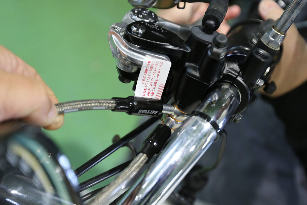 ブレーキホースを確実に装着し、エア抜き作業も確実に行ないます。レバー操作に手応えが出たところで、バンジョーやエアブリーダーからブレーキフルードのにじみや漏れ等がないか入念に確認します。また、周辺にブレーキフルードが付着している場合は、ブレーキクリーナー等で綺麗に拭き取っておきます。