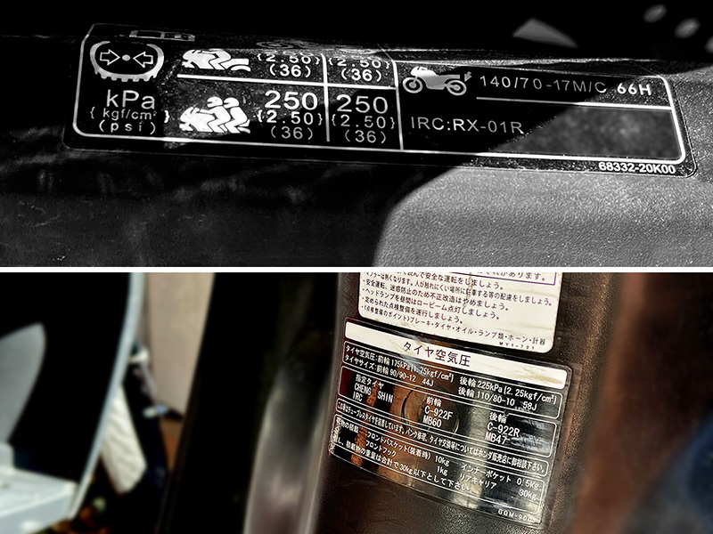 チェーンカバー上の空気圧の表示と、下はBenly PRO50の表示。ホンダのスクーター系は足元に表示があるようです。