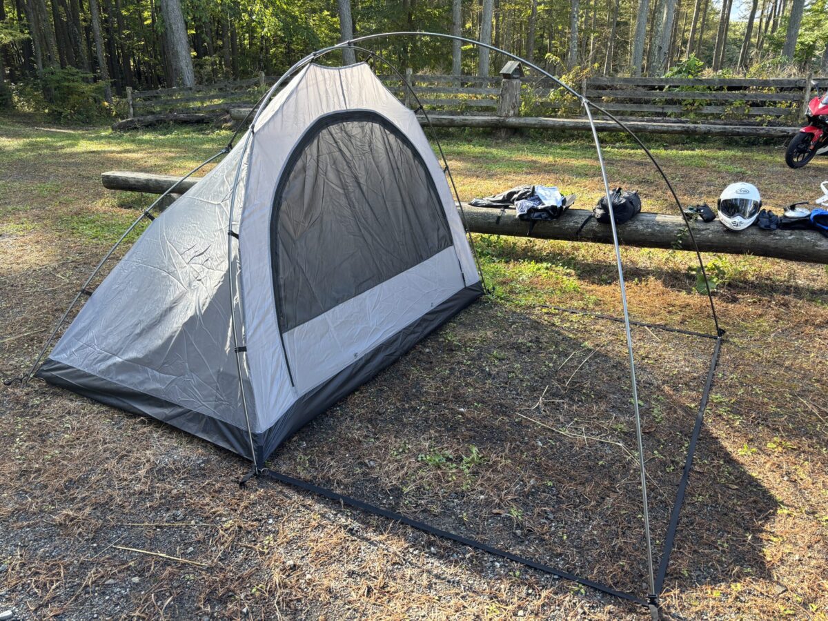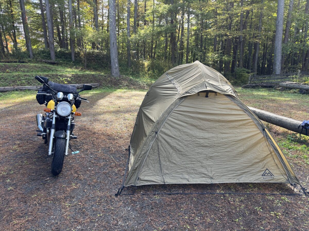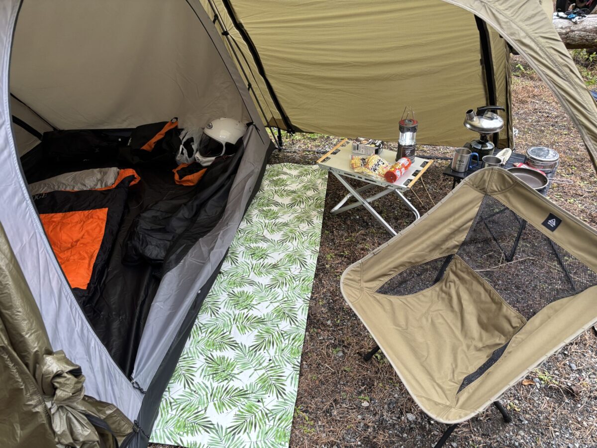 専用バッグに収めた時のサイズがコンパクトで、展開・設営すれば2人用ぐらいの室内となるマエヒロドームDUO。前室も広々でXJR1300も入れられるサイズ感は、雨天時に役立つはず。また、設営のしやすい設計や機構を採用しているため、初心者から使いこなせそう。個人的には手足を伸ばして就寝できたことに感動です。