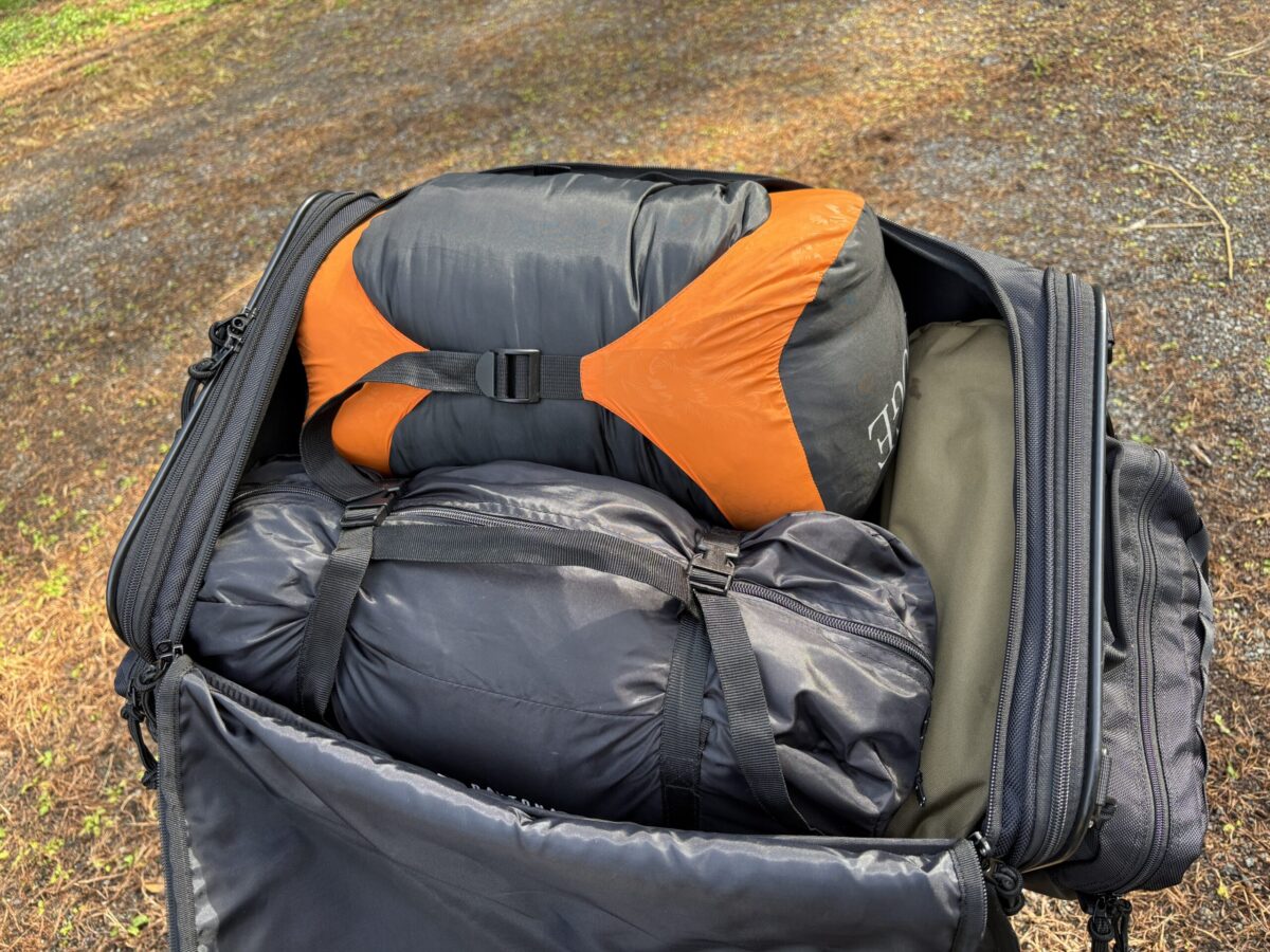(1)は荷物を積んだことによって重心が高くなることを出来るだけ抑える考え方で、シートバッグ内で言えば、テントやテーブル類は下、シュラフや食器等は上になるよう収めます。