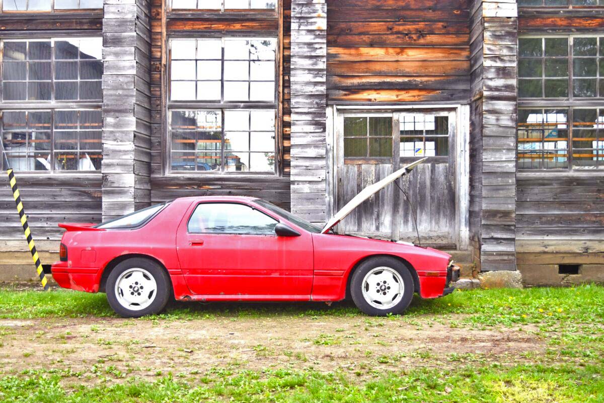体育館の外で雨ざらしのクルマも、よく見れば名だたる名車だったりします。これは二代目サバンナRX-7ですね。レストアされて走り出す日を待っているのでしょうか。