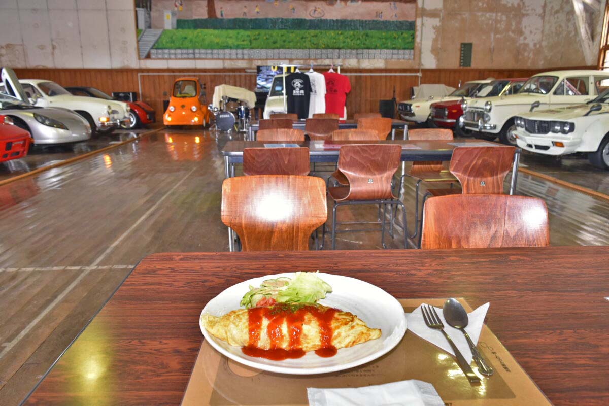 屋内展示場には入館料500円を支払うか食事や飲み物をオーダーすることで入館できます。木造の体育館で旧車を見ながら飲食ができる場所など世界広しと言えどもここだけ。展示車が売れると、別の車がやってくるなど、常に新陳代謝が図られているのも嬉しいです。