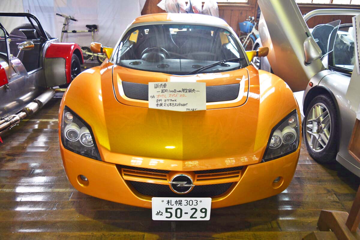オペル(ドイツ)の自動車生産100周年を記念して、2003年1月11日に発売されたモデルです。同社初の量産本格スポーツカーおよびオープンカーで、エンジンはミドシップ方式を採用。シャーシはロータス・エリーゼを流用しています。国内デリバリーは100台ポッキリ。その中の一台がここで販売されています。