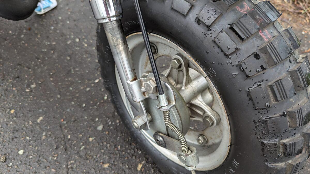 タイヤは前後F-3.50-8のブロックタイヤを装着。用途が限られるサイズですが、今でも購入可能です。足回りは剛性に不安しか感じさせない「なんちゃって倒立フロントフォーク」を装備。