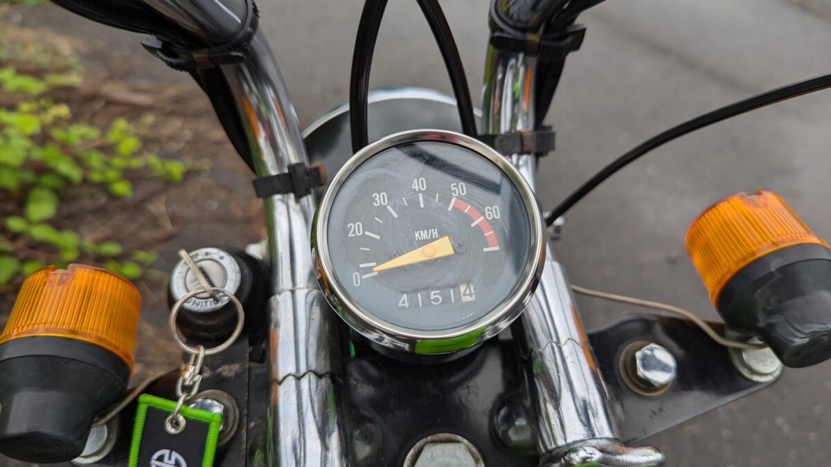 スピードメーターは最高時速80㎞を表示。オーナーさんは、「せいぜい40㎞が限界。それ以上だと車体もブレーキも持たない」と言います。