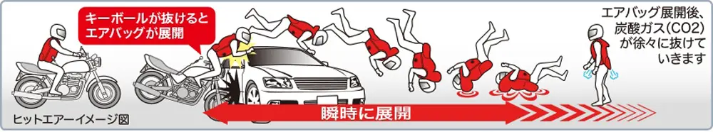 当時はバイク本体に搭載するエアバッグの研究開発が主流であったものの、バイク転倒時はライダーがバイクから投げ出されてしまうケースが多いため、その後バイク用エアバッグの研究開発はライダー自身に装着するタイプへとシフトしていきました。
