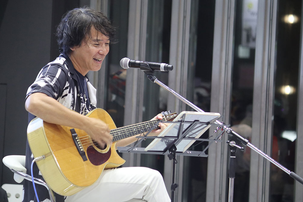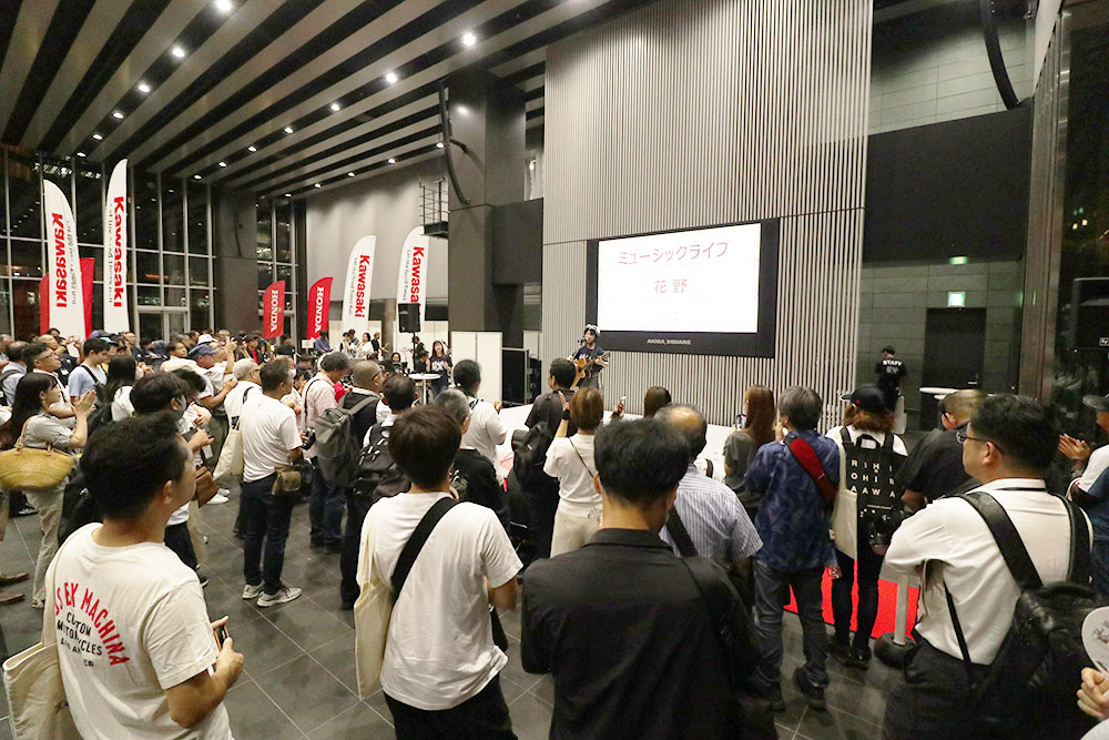 ステージイベントの最後を務めるのは、2組のアーティストによるミュージックライブです。折り畳めるトラベルギターを愛車のHonda「レブル250」に積んでバイク旅をするシンガーソングライター 花野(かの)さんと、第1部のトークショー「ライダーの安全運転とマナー向上」に登壇されたモータージャーナリストの河西さんがミュージシャンとして登場。それぞれお得意の曲を披露して会場に一体感を与えてくれました。
