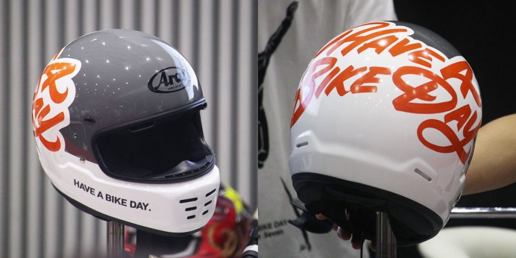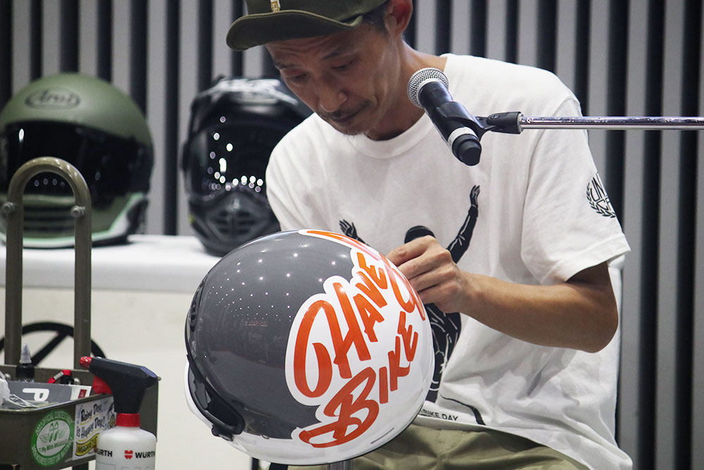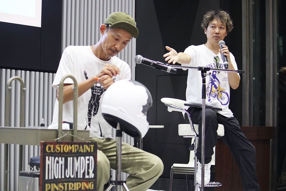 ライブパフォーマンスとトークを組み合わせたコンテンツ「カスタム&アートセッション」では、モーターサイクルアート展覧会&レーベル『HAVE A BIKE DAY』を運営するアーティストの加藤 ノブキさん(以下、加藤さん)と、ペインターの“HIGH JUMPER”増永 修治さん(以下、増永さん)が登壇。デザインのコツや色選びのポイントなどについて加藤さんがレクチャーするなか、増永さんがカスタムペイントを施したヘルメットの仕上げとなるピンストライプを実演する、普段見ることができないコンテンツが繰り広げられました。