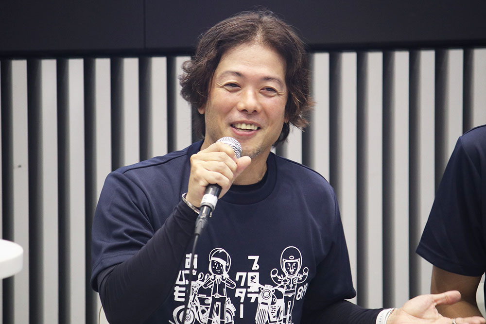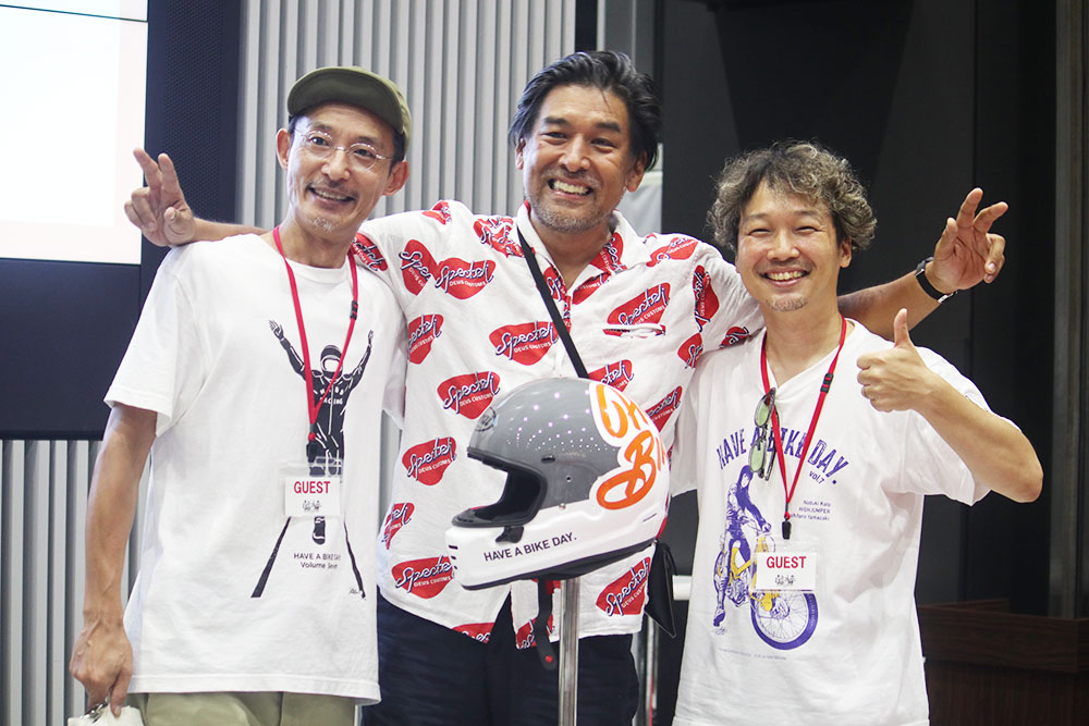 グループツーリングや初心者ライダーの公道デビューに話が及び、ライダー同士はもちろん、周囲を走るクルマのドライバーとのコミュニケーションの大切さや危険予測に対する心構えについて話され、軽快な語り口調ながら正しいことをしっかりと伝えられるお二人の話ぶりに、来場者は真剣に聞き入っていました。