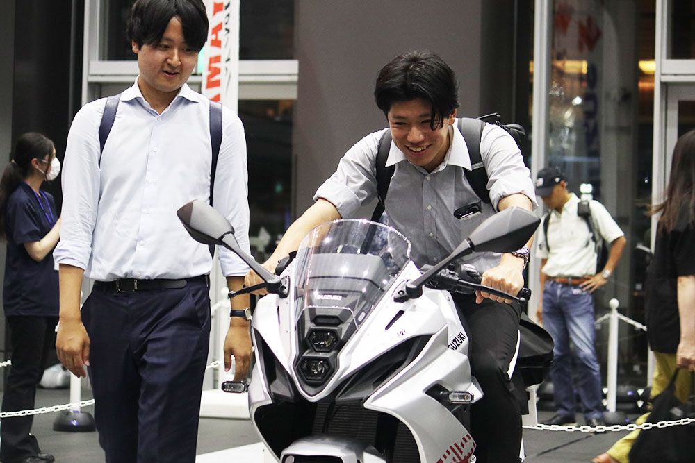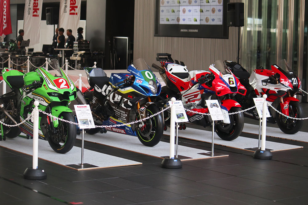 会場の入り口前には、国内バイクメーカー4社を代表するレーシングマシン4台が展示され、来場者の興味をグッと惹きつけていました。左から、「MFJ全日本ロードレース選手権シリーズ」ST1000クラスに参戦している「Kawasaki Plaza Racing Team」のNinja ZX-10R ST1000仕様、「2025 FIM世界耐久選手権 “コカ・コーラ”鈴鹿8時間耐久ロードレース 第46回大会」(以下、鈴鹿8耐)に参戦した「チームスズキCNチャレンジ」のGSX-R1000R、「MotoGP(FIMロードレース世界選手権)」でも使用されているHonda HRC Test TeamのRC213V、鈴鹿8耐参戦カラー「#21 YAMAHA RACING TEAM」のYZF-R1の4台です。