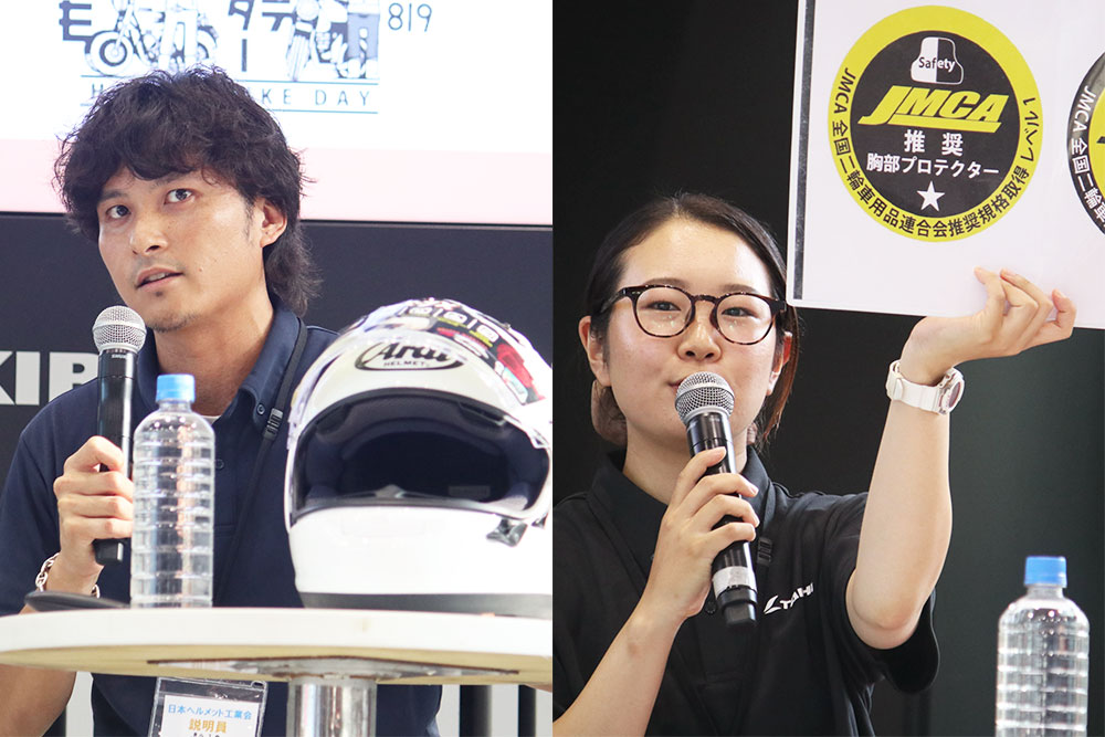 ヘルメットの重要性について語る相神氏(左)と、胸部プロテクターの特徴や選ぶ際のポイントについて語る篠田氏(右)