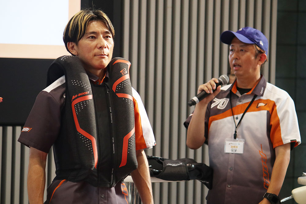 ヒョウドウプロダクツ 神谷氏(右)は最新のエアバッグウエアを作動させて実演してくれました