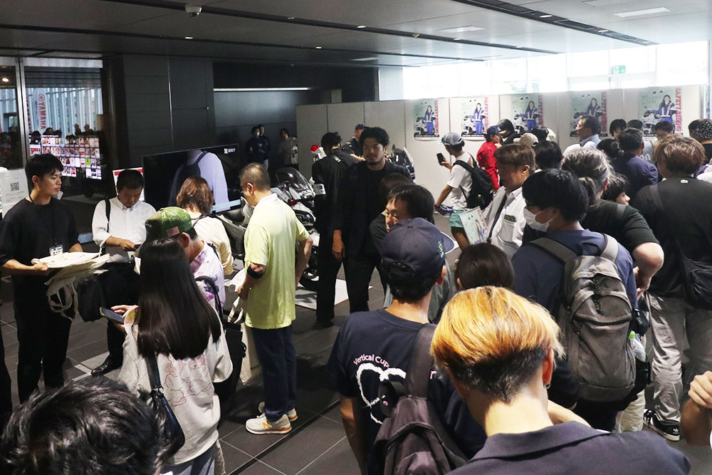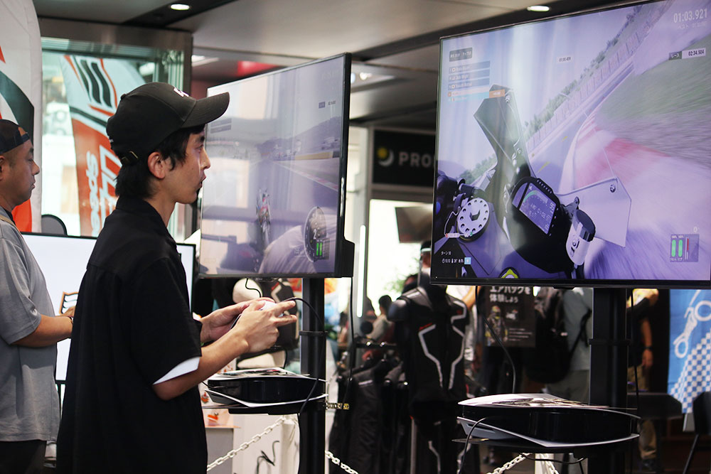 世界中のバイクメーカーの新旧バイクを細部に至るまで忠実に再現し、迫力ある映像とともにスピード感あふれるレースを体感できるバイクレースゲーム「RIDE 5」が無料で楽しめるコーナーも用意されました。ゲームの街・秋葉原にふさわしいコンテンツに、バイクとゲームを楽しみたい来場者が行列を作り、その没入感を味わっていました。