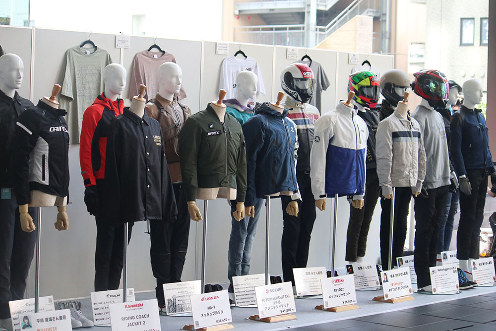 アパレルの展示は「安全とファッションを両立しておしゃれを楽しんで欲しい」という主催者の思いを込めた今回初の試みで、国内バイクメーカー4社のおすすめライディングウエアをはじめ、アパレルブランドのおすすめコーディネートや今回の「バイクの日」トークショーのゲストやMCが自分の「分身」「抜け殻」と紹介していた、愛用のヘルメットやライディングウエアがずらりと展示されました。二輪車業界で活躍する人がどんな風にコーディネートしているのか、用品選びに悩んでいる人の参考になったようです。
