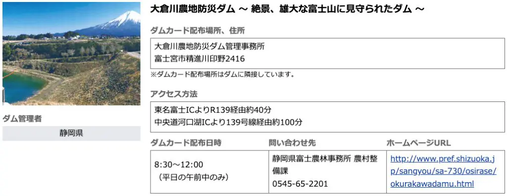 国土交通省のウェブサイトには、ダムカードの配布時間、配布場所、アクセス方法などが記載されているので、まずは目的地を決めて実際に向かう日時にダムカードが配布されているかを調べましょう。