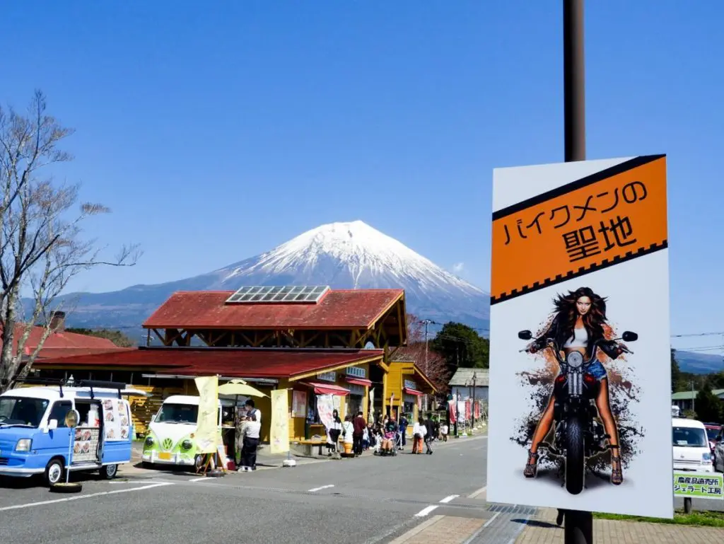 “バイクメンの聖地”の看板で迎えられた富士山を望む富士ミルクランドは、地元朝霧高原で育った牛からとれるあさぎり牛乳を使用したチーズ、ジェラートなどの自社製造販売もあれば、B級グルメも驚くほどリーズナブルな価格で提供されていました。また、バイク専用の駐車スペースも広く用意されており、安心して駐車できました。さすがはバイクメンの聖地!