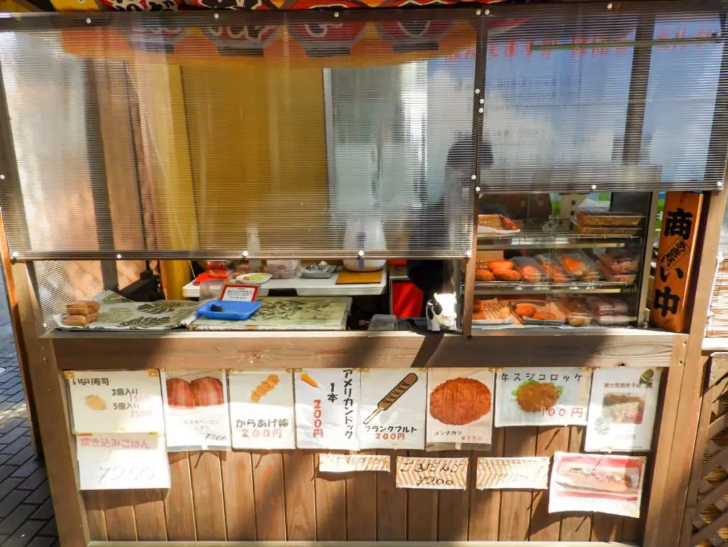 あえて地元のグルメをと、売店でいなり寿司3個(150円)と、ほんのり甘いジャガイモベースの牛すじコロッケ(100円)を購入しランチとしました。