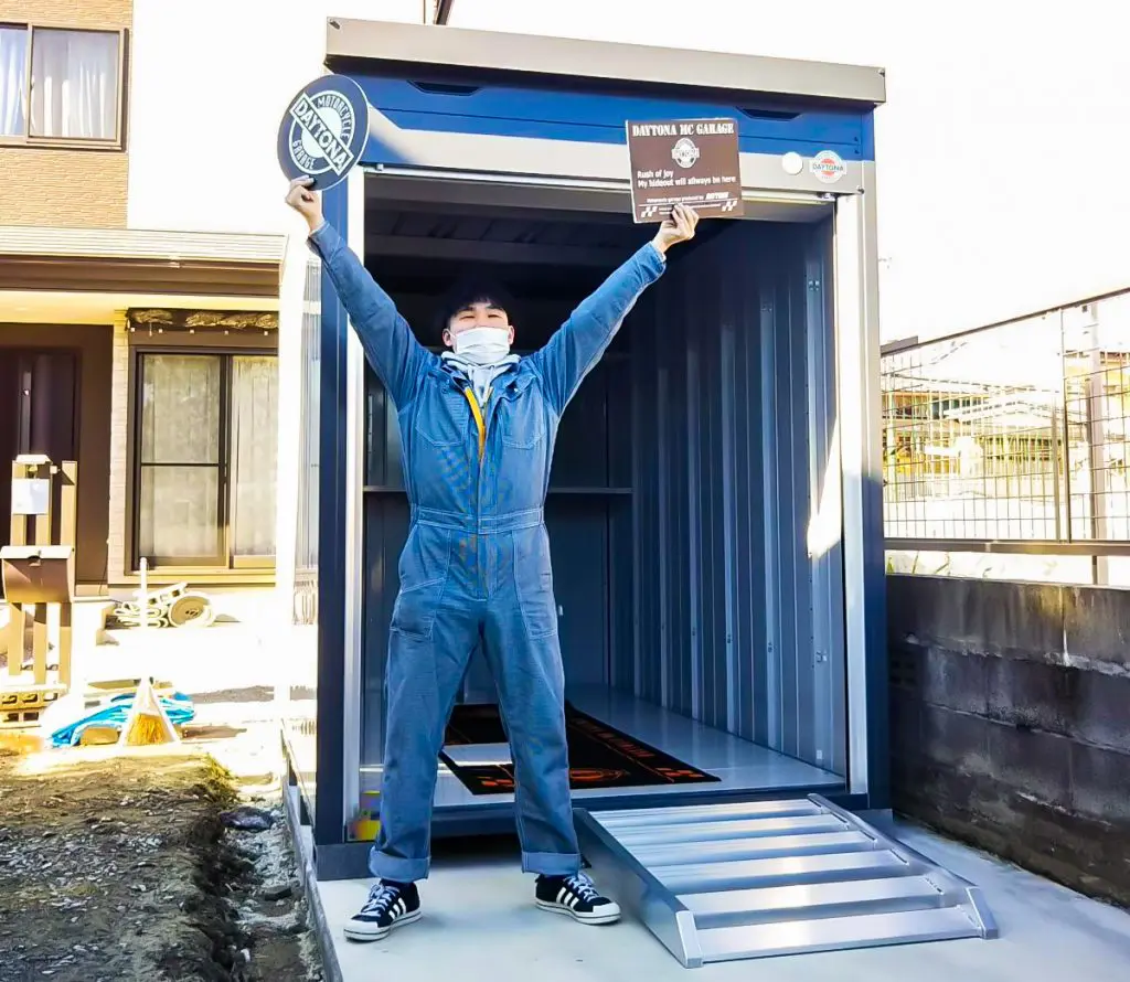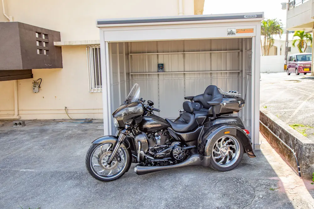 「お気に入りの大きなバイクも安心して格納でき、そのうえ出し入れが楽なので気に入っています。設置までの工期が短かったのですぐに利用することができました。」