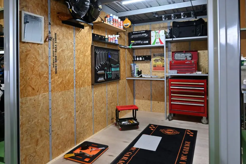 お客様の多くは、バイクを収納するだけでなく休日にメンテナンスできる広さの本体サイズを選ばれる傾向があります。大半のバイク愛好家はご自身でメンテナンスをされると認識しており、キャスター付きの収納ボックスや、休憩時に座るベンチなどを置かれている方が多々いらっしゃいます。上記の製品にもユーザーからの要望を反映し、居心地の良い庫内空間を演出しています。