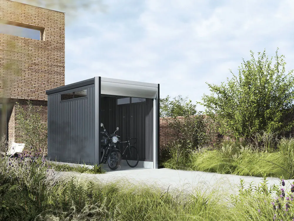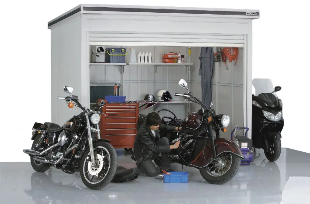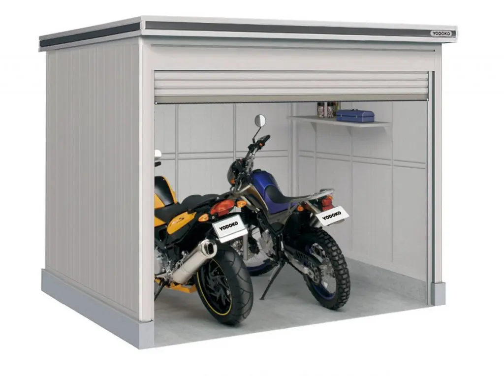 「エルモシャッター」というシャッター式の物置をバイク用ガレージとして用途提案しております。また、クルマ用として販売しているヨドガレージ「ラヴィージュⅢ」にバイク置場を併設して使用していただいているケースも多くあります。