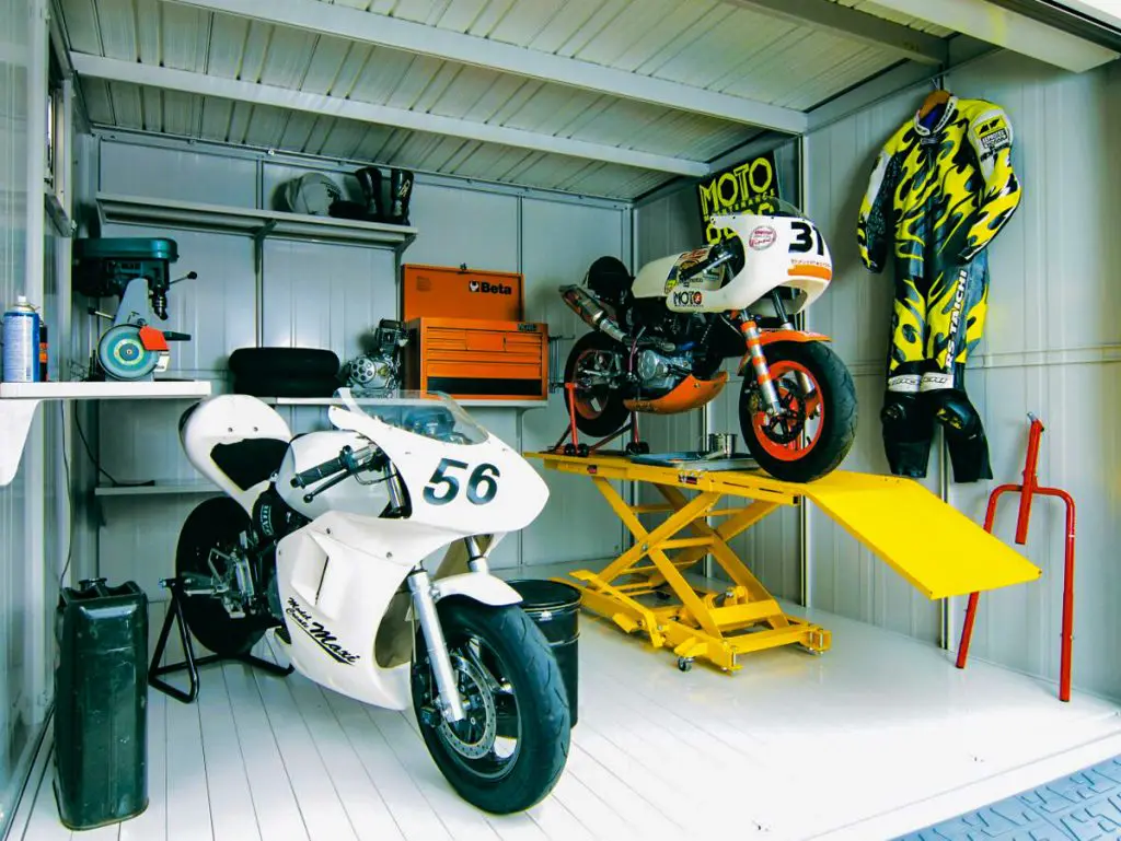 バイクをしっかりと保管する機能はもちろん、ガレージ内でメンテナンスやカスタムなどの軽作業も想定して設計されており、老舗バイクパーツメーカーとしての知見が活かされていることが伺えます。