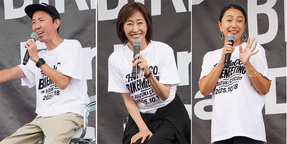 続いてのトークショーでは、芸能界きってのMotoGPファンとして知られるお笑いコンビ「チュートリアル」の福田 充徳さん、俳優の高島 礼子さん、タレントの三船 美佳さんら、バイクを愛する著名人が登壇。バイクに乗るようになったきっかけや、来場したライダーへの想いなどを語りました。