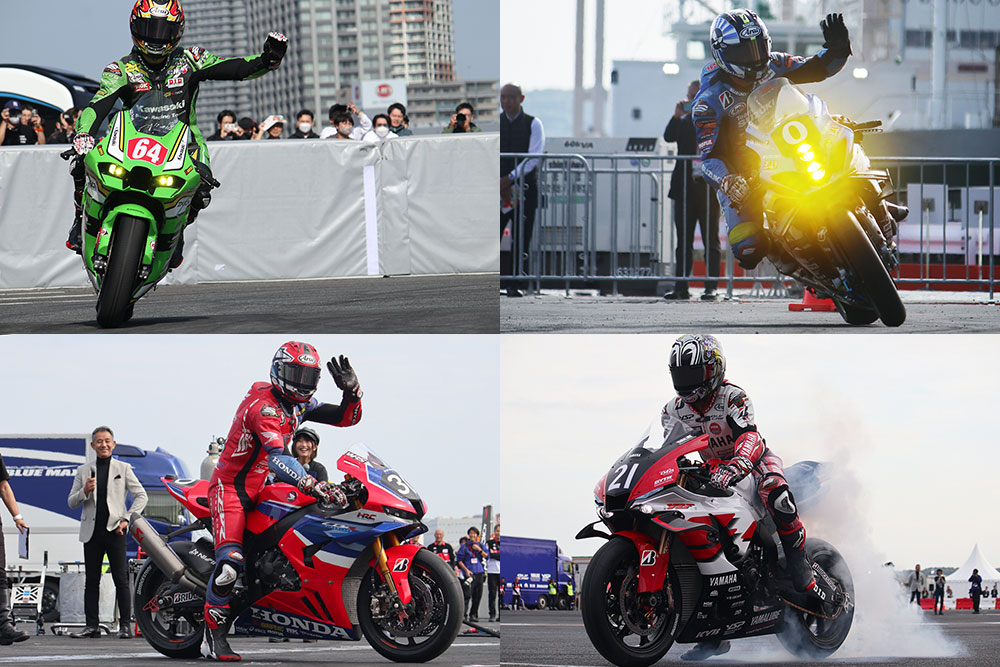 国内4メーカーが用意したのは、今年の鈴鹿8耐を実際に走ったレーサーです。モータースポーツファンにとっては、これらのマシンを都心で一堂に会した姿が見られるだけでも感動を覚えるでしょう。さらに、鈴鹿8耐を戦い抜いたライダー4名がそれぞれのレーサーでデモ走行を披露しました。これほどの至近距離でプロの走行を見られる機会は滅多にないため、非常に貴重な機会となりました。