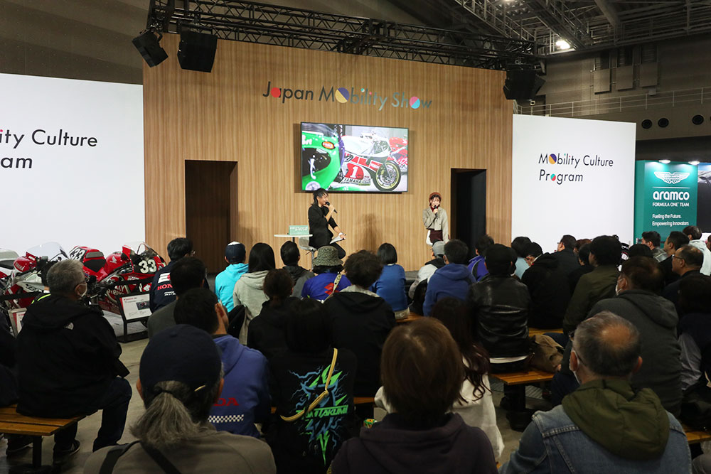 「JMS2025の会場内を巡らせてもらったなかで興味深かったのは『タイムスリップ・ガレージ』です。展示されている1980~1990年代のグランプリレーサーを見て、私は当時をまったく知らない世代なのですが、メーカーごとに異なるムードやイメージが現在にも通じるなと感じました。JMS2025は最新のクルマやバイク、さらには未来のコンセプトモデルなどのお披露目がメインですが、かつて活躍したバイクやクルマが埋もれないためにも、こういう展示は大切だと思います」