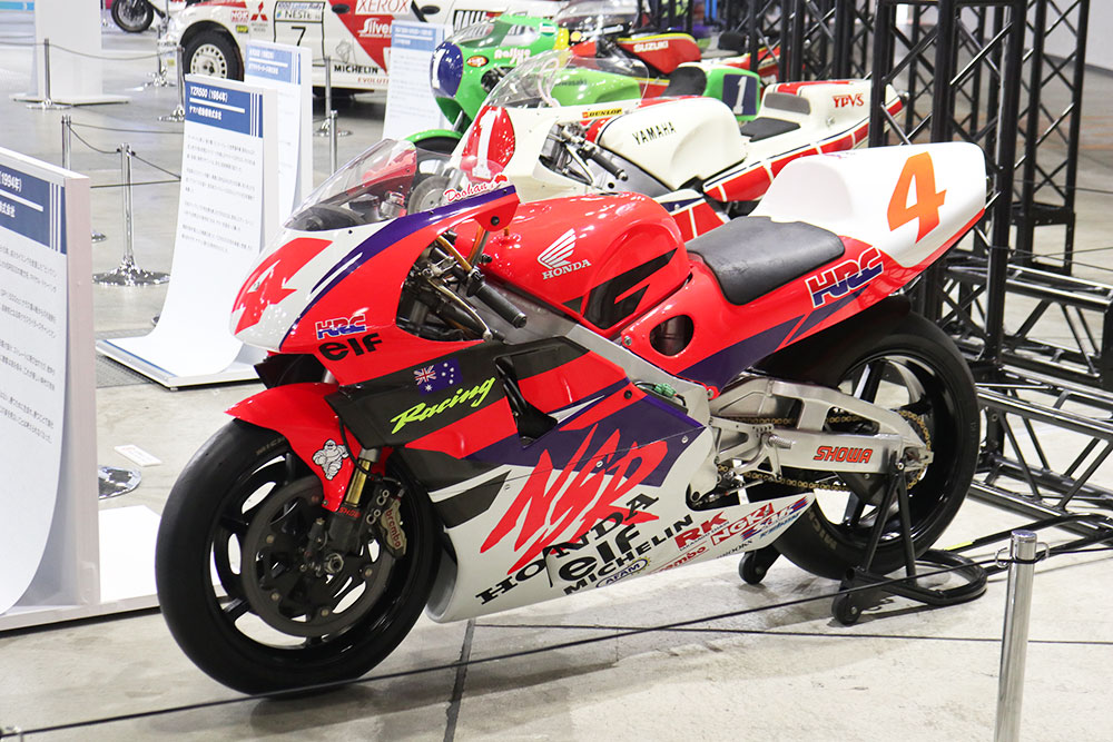 ホンダ「NSR500」は、1984年から2002年までの19シーズンにわたって、 HRCがWGPに投入していたマシンです。展示車両は、14戦中9勝を挙げて500ccクラスのチャンピオンを獲得したミック・ドゥーハン選手の1994年モデルです。