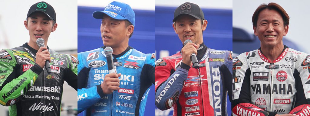 2015年の鈴鹿8耐をテレビ観戦していた岩戸 亮介選手(Kawasaki Plaza Racing Team / 以下、岩戸選手)は「いつか自分も出場したい」とそのときに思い、今年その願いを叶えました。津田 拓也選手(チームスズキCNチャレンジ / 以下、津田選手)は、レーサーに用いられている環境に配慮した素材を詳しく解説。高橋 巧選手(HONDA HRC※ / 以下、高橋選手)は、当初3人体制で臨む予定だった鈴鹿8耐の数日前にイケル・レクオーナ選手が手続きの都合により参戦を見合わせることになり、ヨハン・ザルコ選手と2人体制となった際の心境を語ってくれました。6年ぶりのファクトリーチームの一員として参戦した中須賀 克行選手(YAMAHA RACING TEAM / 以下、中須賀選手)は「6年前とは比べものにならない暑さでした」と、大変だったレース時の状況を話してくれました。