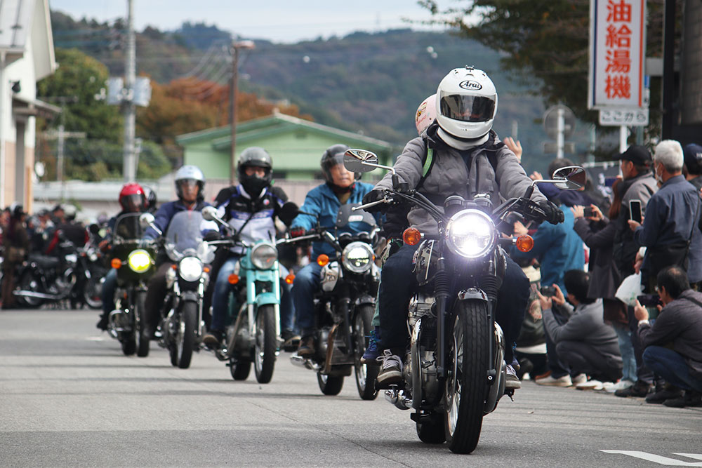 第1回から行われているのが、風光明媚な那須烏山市の那珂川周辺を一周するパレードランです。およそ13kmのルートを30分ほどかけて走るもので、車種を問わず参加は自由。旧メグロ、新メグロなどグループに分かれてメグロの聖地 那須烏山を周遊します。