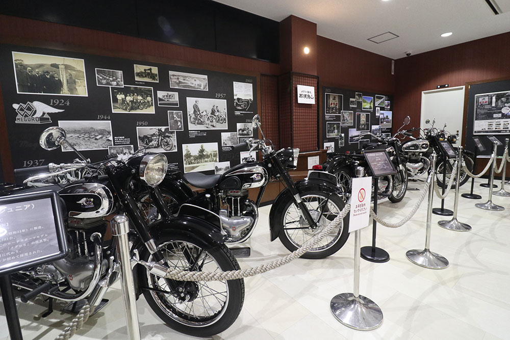 山あげ会館内のメグロ展示スペースでは、2025年3月10日に「ホンダコレクションホール」から寄贈されたメグロ5台(S2、S3、Y2、K、SG)が展示されています